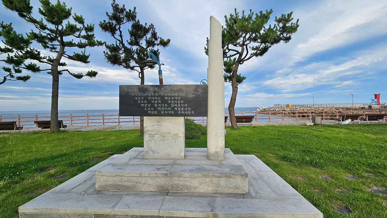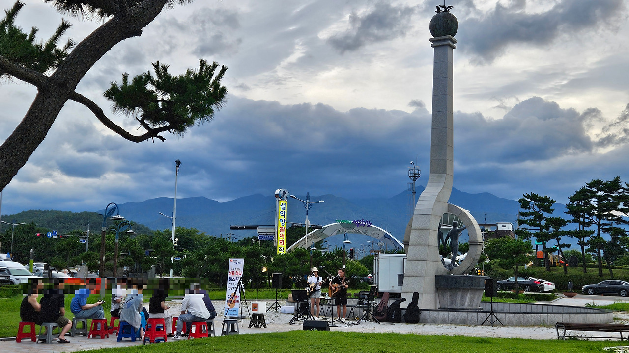 젬버리 기념탑 / 희망광장 (선율하나, 버스킹 통기타 라이브 공연) 어선들이 정박하는 설악항이 있는 곳이기도 하다. 버스에서 내리자마자 나의 젊은 시절 7080을 노래해 주는 고마운 통기타 듀엣팀 ‘선율하나‘가 설악산을 배경으로 라이브 버스킹 공연을 하고 있었다. 지체 없이 바로 즉시 열혈팬이 되었다. (네이브 카페 '선율하나'에 공연일정이 나온다)