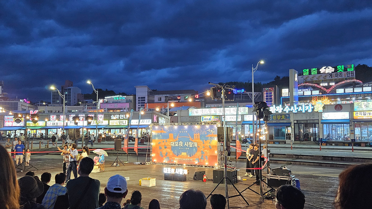 대포항 관광 수산시장 앞 공연 속초가 개항되기 이전에는 대포항이 강원도의 중심항이었다. 그러나 1937년경 대포리에 있던 면사무소가 속초리로 옮겨갔다. 당연히 청초호 주변 속초항으로 무게 중심이 옮겨 갔다. 대포항은 한적한 포구로 전락해 버렸다. 이런 점이 나에게는 더욱더 매력적으로 다가왔다. 대포항수산시장 주변 해변에서 낚시하는 주민과 라이브 공연을 하는 장소가 있는 곳이라면 이보다 더 좋은 곳이 있을까?