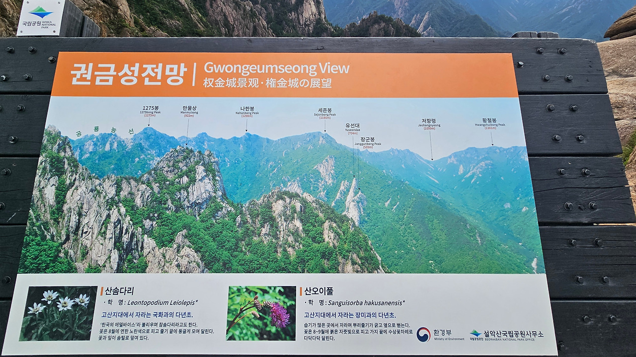 권금성 전망 전망판에는 공룡능선 1275봉 나한봉 세존봉 저항령 황철봉이 나타나 있다.