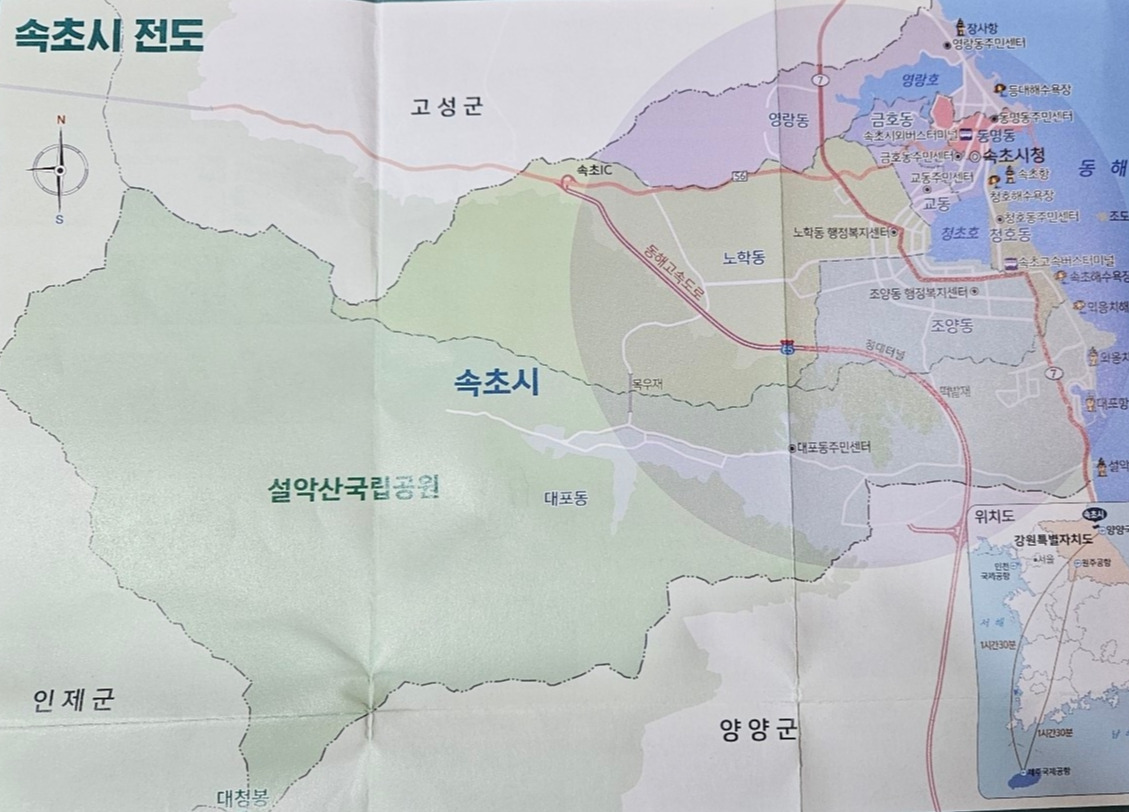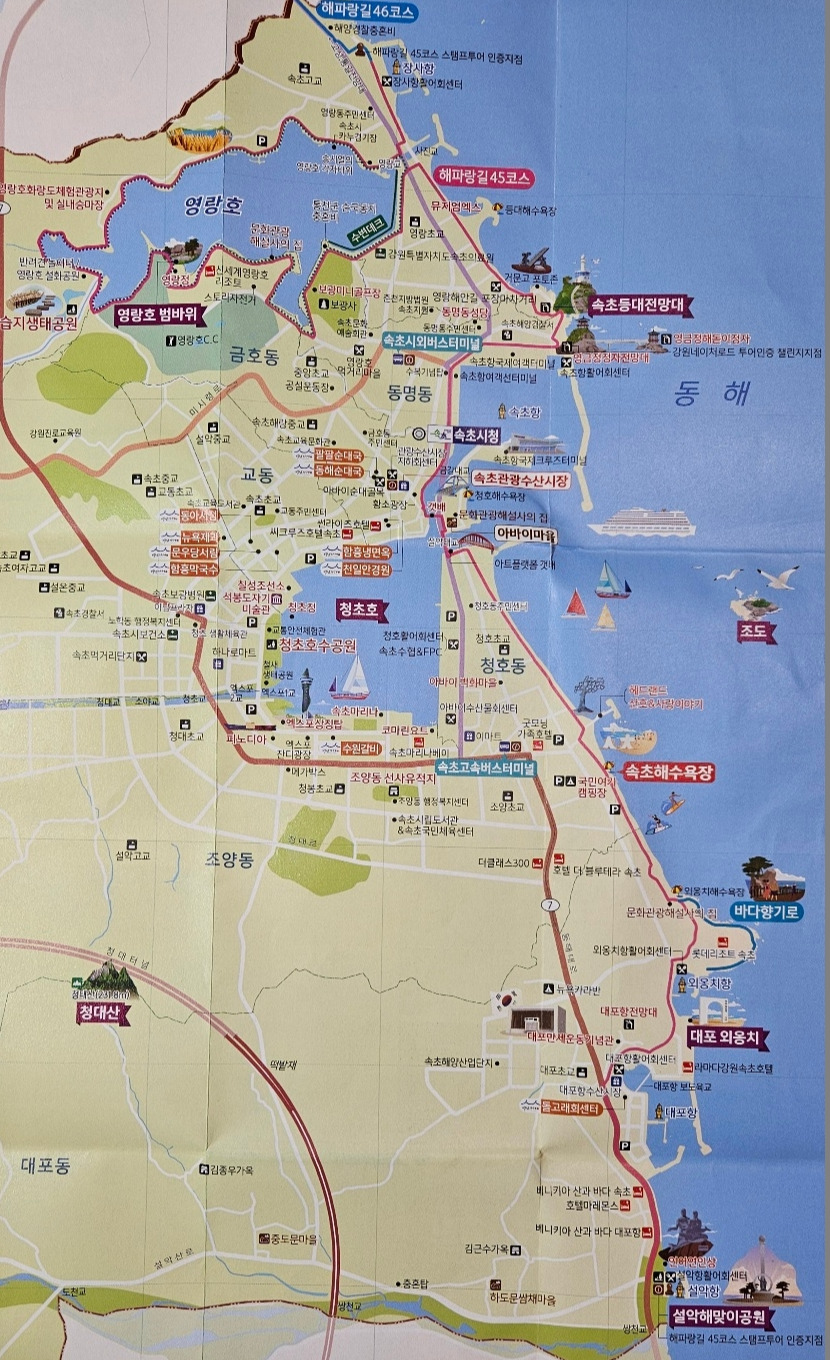 속초 지도 시골 내륙에서 태어나 초등학교 6학년 수학여행 때 출렁이는 바다를 처음 봤다. 그때부터 바다라고 하면 사족을 못쓰게 되었다. 바다는 나의 동경의 대상이었다. 속초는 등대 어항 어선 여객선, 4개의 해수욕장, 바다와 연결된 2개의 거대한 호수를 두루 갖추고 있어 좋아할 수밖에 없다. 더구나 설악산까지 곁에 있으니.