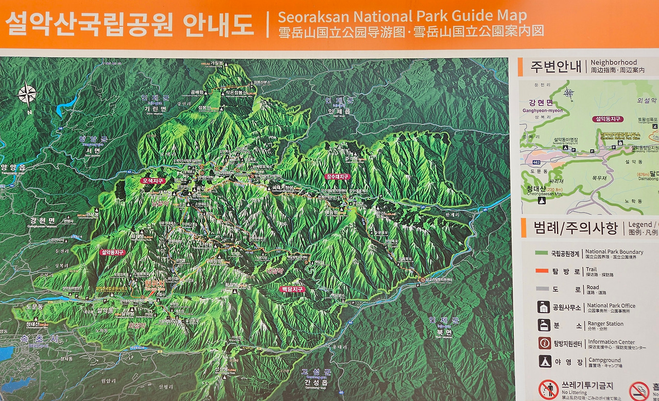 설악산 국립공원 안내도 소원대로 설악산 흔들바위를 흔들어 보고, 금강산에 못 올라간 울산바위의 통짜 울타리를 탐방(편도 3.8km, 2시간 소요)하고 내려왔다. 이어서 신흥사경내를 구경하고, 케이블카를 타고 권금성을 탐방한 후, 속초바다(설악항, 대포항)로 이동했다.