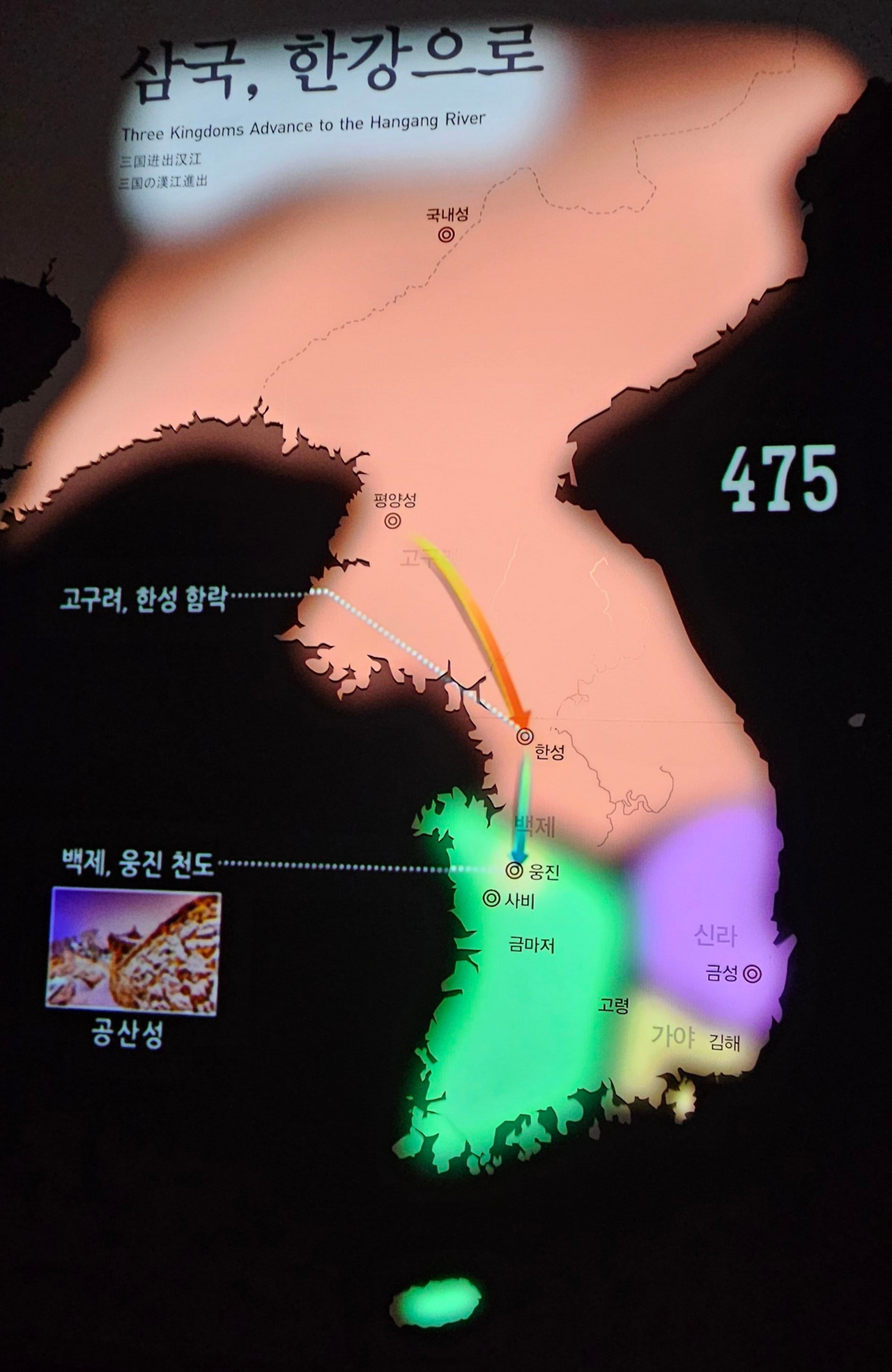 475년 고구려 장수왕의 침입으로 위례성(풍납토성 몽촌토성)에서 백제 개로왕 전사. 웅진(공주)으로 천도, 백제 문주왕 즉위 (文周王, 재위 475~477)