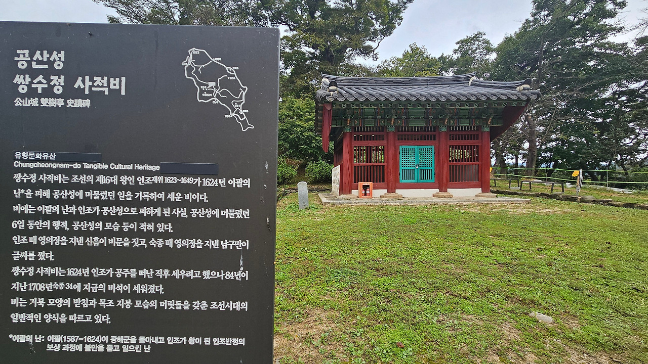 조선 인조가 이괄의 난(1624, 인조 2)을 피해 일시 파천 5박 6일간 머물렀다. 두 거루의 나무(쌍수)에 기대어 한양을 걱정하던 인조가 난의 평정 소식을 듣고 기뻐하며 이 쌍수에 통훈대부라는 벼슬을 내렸다. 그 자리에 정자를 세웠다. 인조 이후 공산성을 쌍수산성이라고 불렀다.