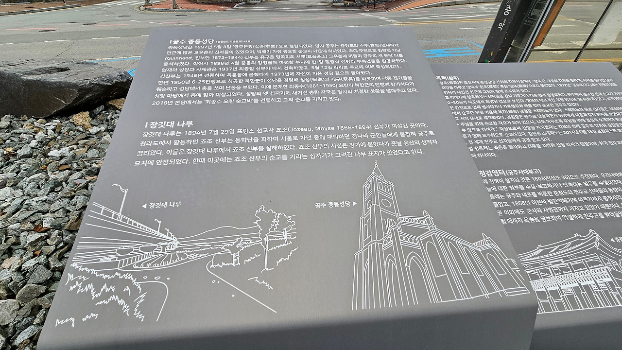 제민천 다리를 건너가니, 공주중학교 건너편에 황새 바위 순교 성지 안내 간판이 보였다. 사전 정보가 없어 잠시 당황했지만, 망설이지 않고 언덕 위 황새 바위 순교 성지로 바로 올라갔다. 성지 순례를 하면 언제나 종교 혹은 신념을 위하여 목숨을 기꺼이 내어 놓는 선조 선현들의 용기에 경건한 마음을 가지고 돌아온다.