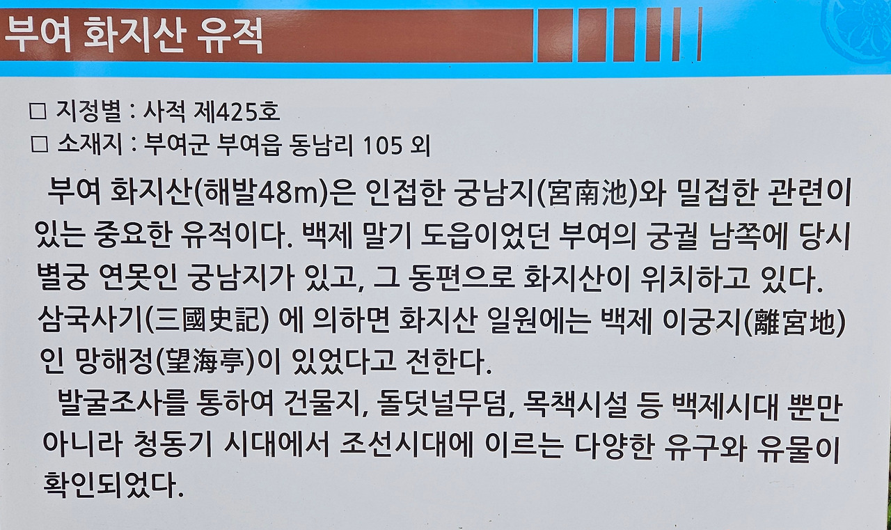 부여 궁남지 동쪽에 위치한 화지산은 백제 사비시대의 이궁지(異宮址)로 전해지는 곳이다. 궁남지 방향의 산비탈 경사지에 넓은 면적의 표토가 드러나 황토색을 띠고 있었다. 발굴조사 결과 백제시대에 건립된 팔각 우물, 초석건물지와 기단시설물을 발굴했다.