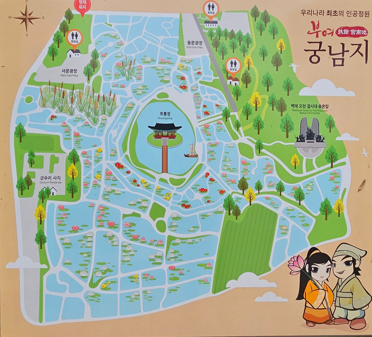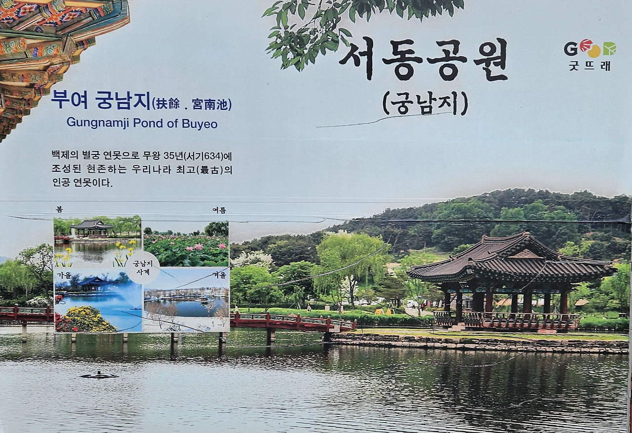 현존하는 우리나라의 가장 오래된 인공 연못이다. 연못 안 섬 위에 포룡정 정자가 있다. 주변의 버드나무와 100만 송이 연꽃이 어우러져 있다. 수련, 열대수련, 수생식물이 자라고 있다. 매년 7월 부여서동연꽃 축제가 열린다.