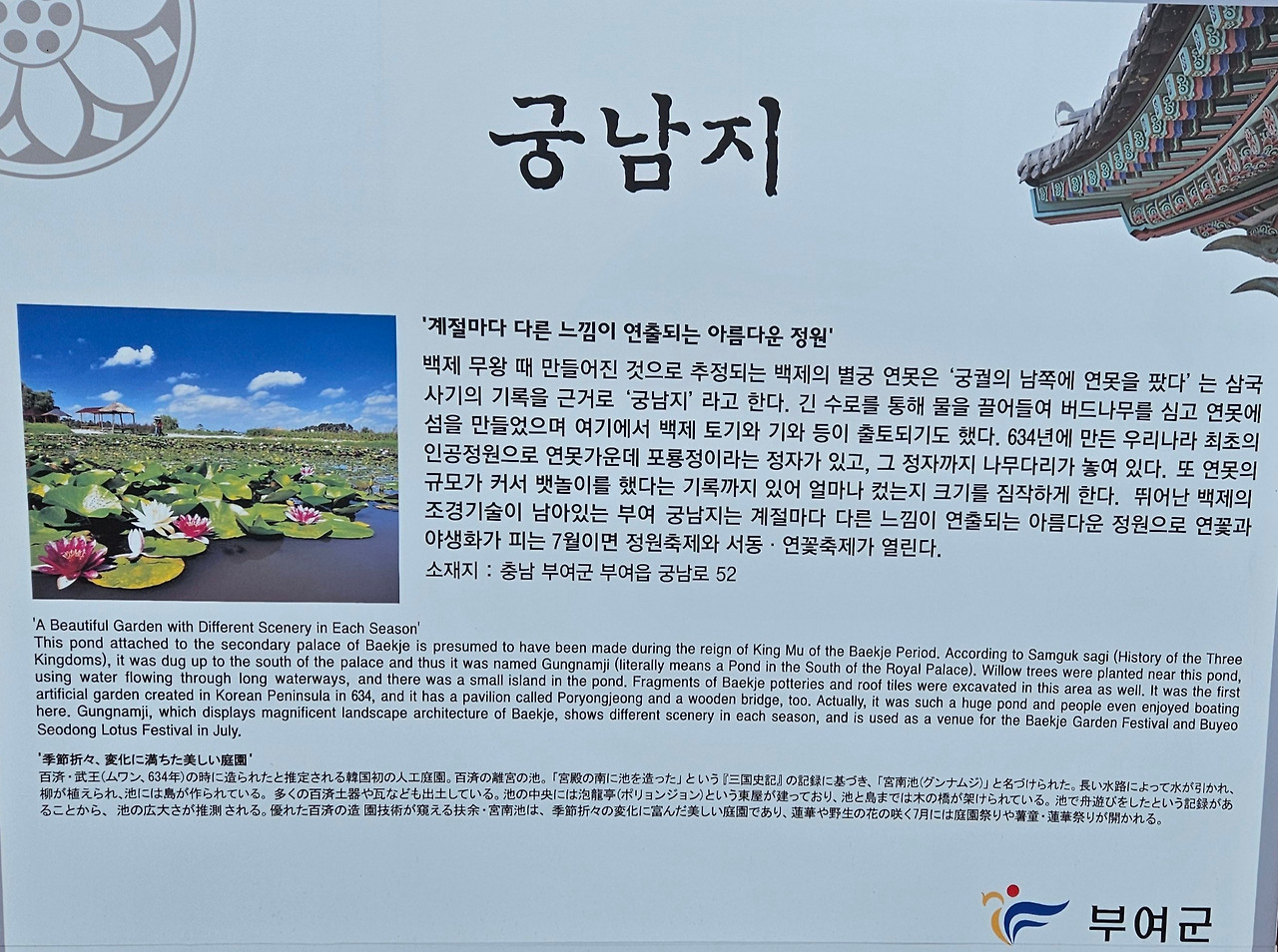 일본서기에는 궁남지의 조경(造景) 기술이 일본에 건너가 일본 조경의 시초가 되었다고 전하고 있다.