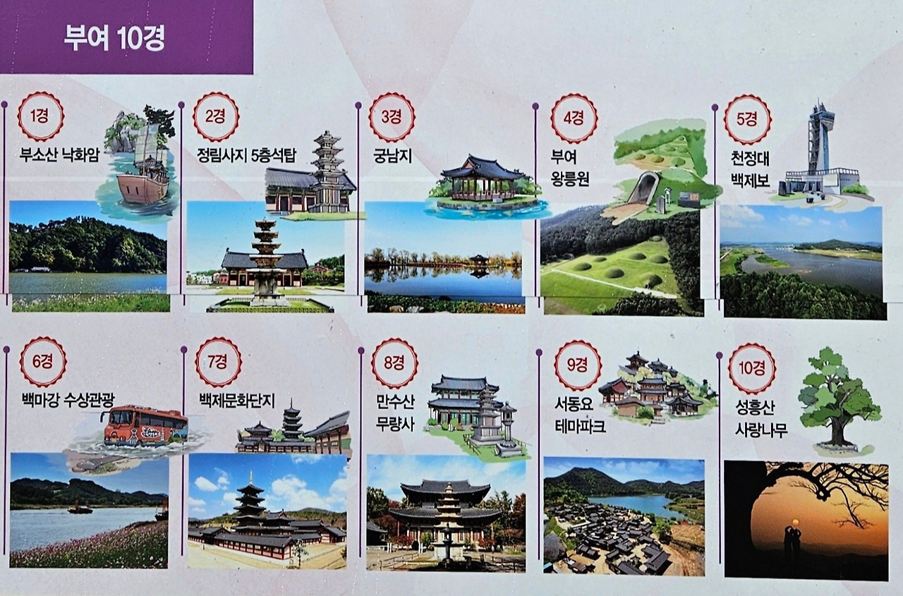 부여 버스터미널> 신동엽 시인 생가 및 문학관> 부여성당> 부여성당 신축부지 유물 발굴> 부여군청> 궁남지(포룡정)/서동과 선화공주/계백오천결사대 충혼탑> 화지산유적> 국립부여박물관> 정림사지 오 층 석탑/ 정림사지박물관> 관북리유적> 삼충사> 부소산 낙화암