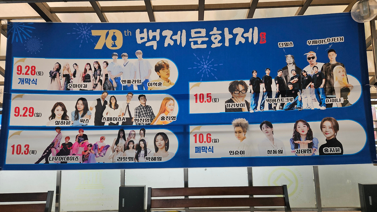 부여시외버스터미널에서 하차했다. 가수들 얼굴과 일정이 큼직한 축제(제70회 백제 문화제, 2024.09.28.~10.06) 안내 플래카드에 걸려있었다.