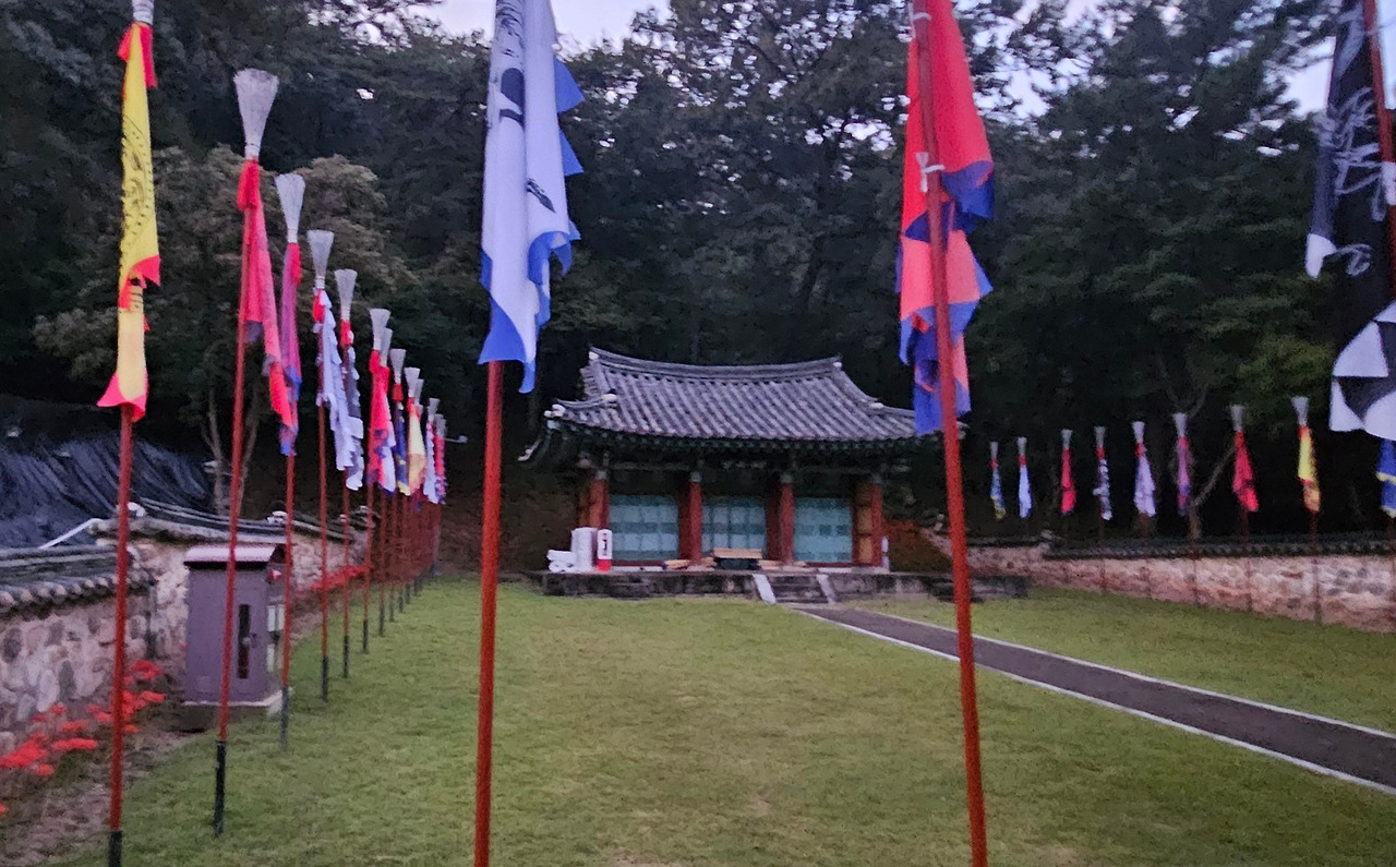 궁녀사 문 밖의 빨간 꽃무릇과 그 주변에 낙화된 하얀 무궁화가 궁녀와 태자를 상징하는 것 같았다. 궁녀사 경내에는 불도 꺼져 있었고, 문도 굳게 닫혀 있었다.