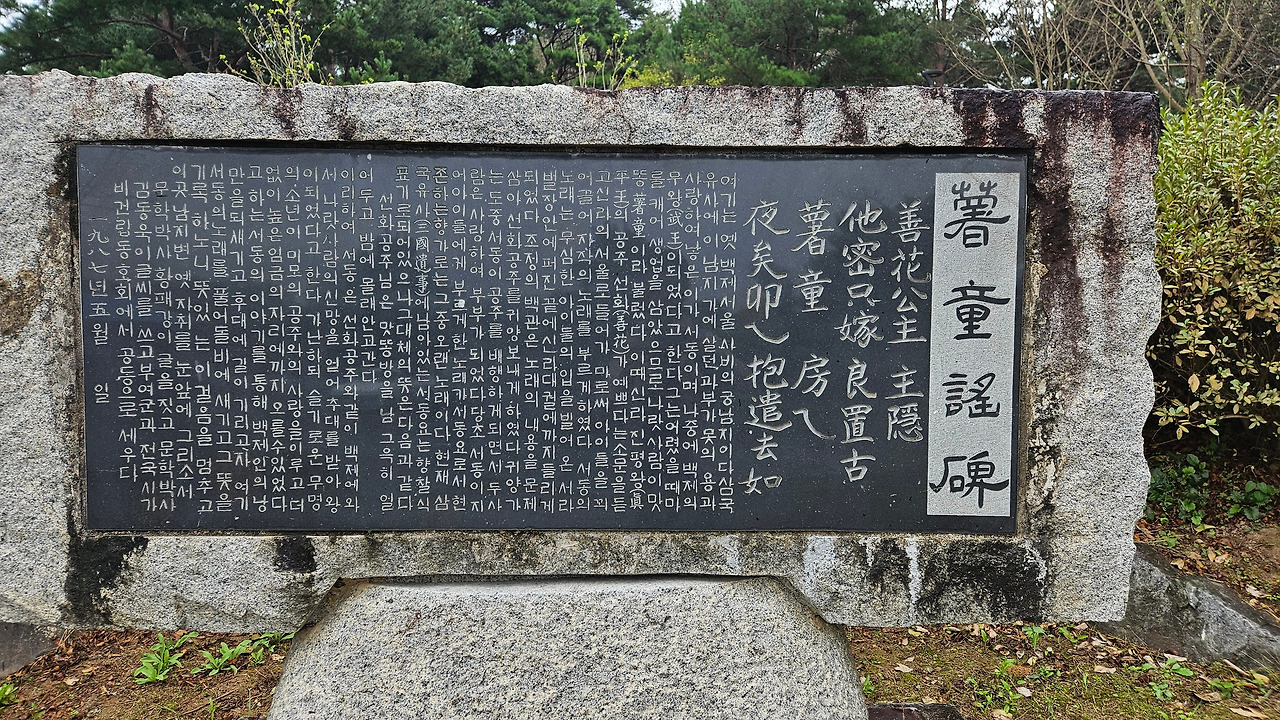 신라 제26대 왕인 진평왕의 셋째 딸 선화공주는 절세미인이었다. 훗날 백제의 30대 왕이 되는 무왕(武王), 서동은 어린 시절 공주를 연모하여 선화공주가 실은 밤마다 남몰래 서동의 방으로 찾아가 만난다는 내용의 노래 〈서동요(薯童謠)〉를 신라에 퍼뜨렸다. 이 노래는 곧 진평왕의 귀에까지 들어가 공주는 행실이 정숙하지 못하다며 귀양을 가게 되었다. 이를 미리 알고 있던 서동이 선화공주를 백제로 데리고 와서 행복하게 살았다는 이야기다.