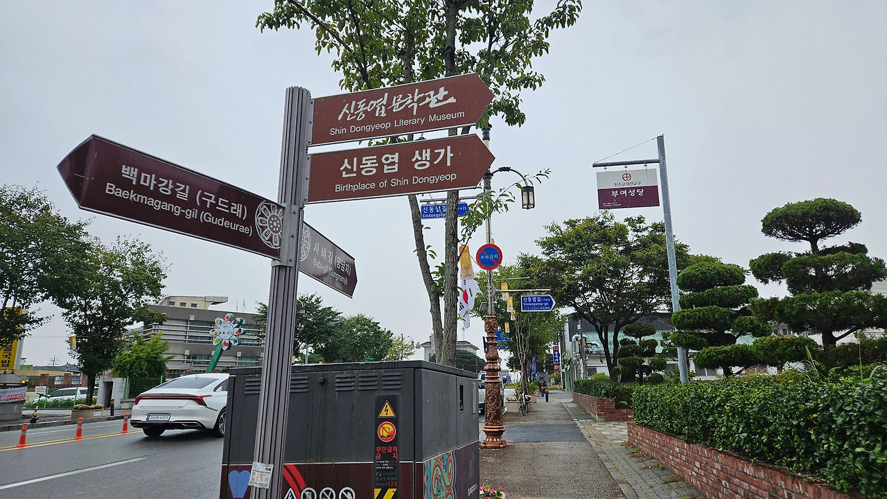 버스터미널에서 옆 부여성당 안 골목에 있다. 신동엽 길이다. 성당 담벼락을 둘러가며 시인의 시가 몇 편이나 도배되어 있다. 동시대에 활동한 김수영 시인(1921년 11월 27일 ~ 1968년 6월 16일)과 함께 1960년대 대표적 참여 시인이다. '껍데기는 가라'는 4.19 혁명정신을 기렸다. '누가 하늘을 보았다 하는가', '아니오', '원추리', '진달래 산천'등 많은 시를 발표했지만, 너무 젊은 나이에 타계했다.