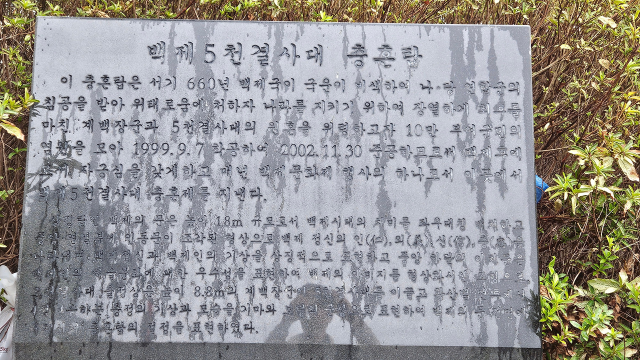 660년에 백제가 멸망할 때 황산벌에서 신라 5만 대군과 싸워 죽은 계백장군 휘하 백제 5천 결사대의 우국충절을 기리기 위하여 세워진 탑이다. 대백제전 행사 때 오천결사대 충혼제를 지내는 곳이다. 당일 비가 왔었는데, 방문 시 충혼제 행사가 종료된 것인지 행사용 시설물을 걷어 차량에 싣고 있었다. 5,000 결사대의 눈물 같은 비가 탑과 탑 설립비에 내렸다. 높이 8.8m의 오천결사대출정상이 있다.