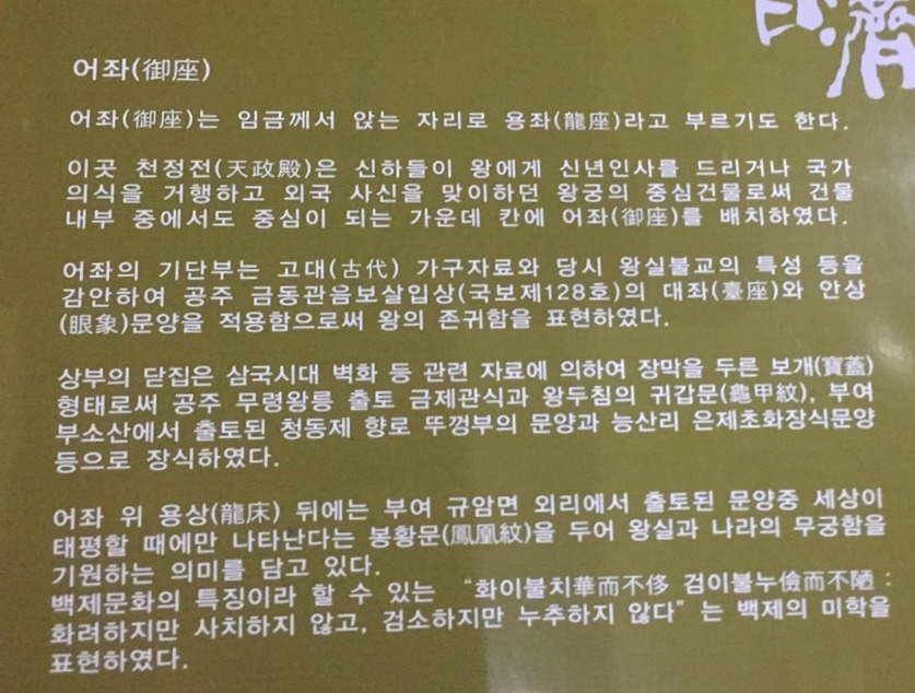 사비궁의 정전으로 국가의 큰 정사를 하늘에 고하여 결정했다는 천정대에서 이름을 따왔다. 왕의 즉위 의례, 신년 행사 등 각종 국가 의식이 거행되고, 외국의 사신을 맞이하는 사비궁 내의 가장 중요한 건물이었다.