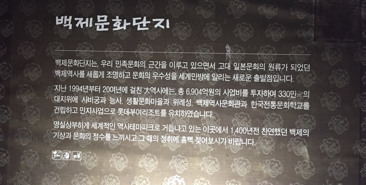 백제문화단지는 약 2년 전에 방문하여 벌써 기억이 가물가물하지만, 보관하고 있는 사진 파일에서 다시 기억을 끄집어내어 본다. 이하 많은 주요 자료는 관련 장소의 홈페이지와 팸플릿을 참조하였음을 미리 밝힌다. 낮에는 주로 리조트 수영장에서 손주 녀석 꼬맹이와 보내고, 야간에 탐방하여 사진이 흑백이다.