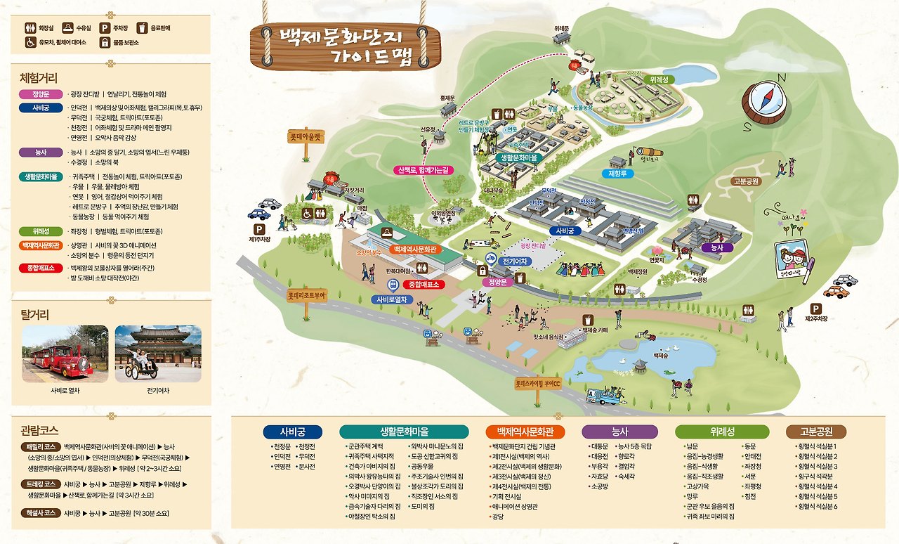 문화역사단지 입구인 정양문(正陽門), 백제 왕궁인 사비궁과 대표적 사찰인 능사, 능사의 연못에 있는 수경정(水鏡亭), 계층별 주거문화를 보여주는 생활문화마을, 개국 초기 궁성인 하남 위례성, 직접 위례성으로 통하는 위례문(慰禮門), 백제 묘제를 보여주는 고분공원, 충남도민의 기증으로 조성된 백제숲, 문화단지 내를 한눈에 볼 수 있는 제향루(濟香樓), 백제의 역사와 문화를 한눈에 보는 백제역사문화관이 있다. (홈페이지 참조)
