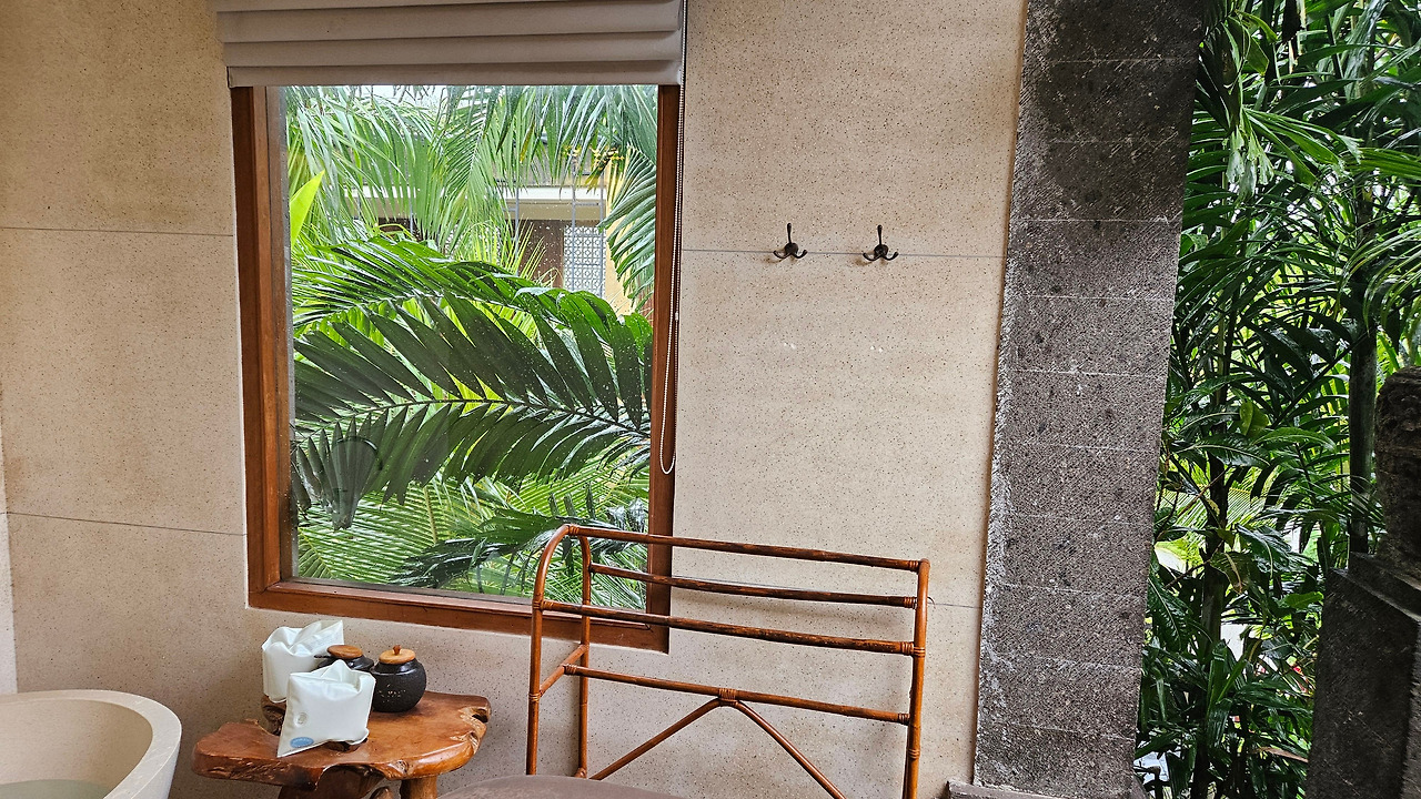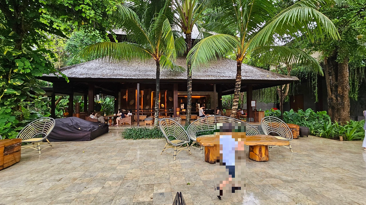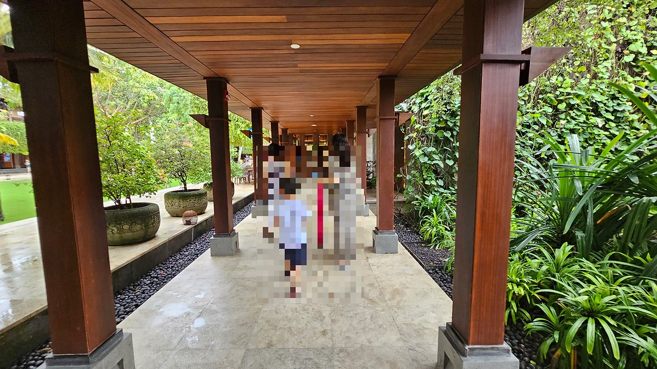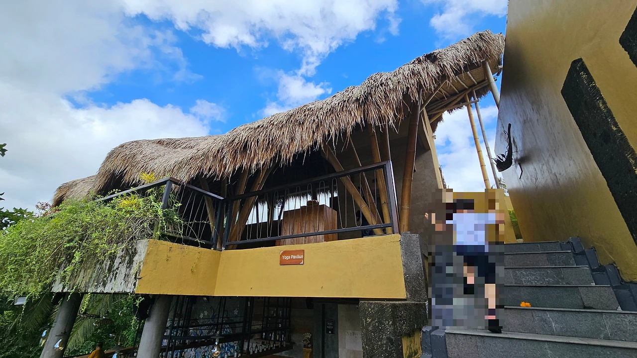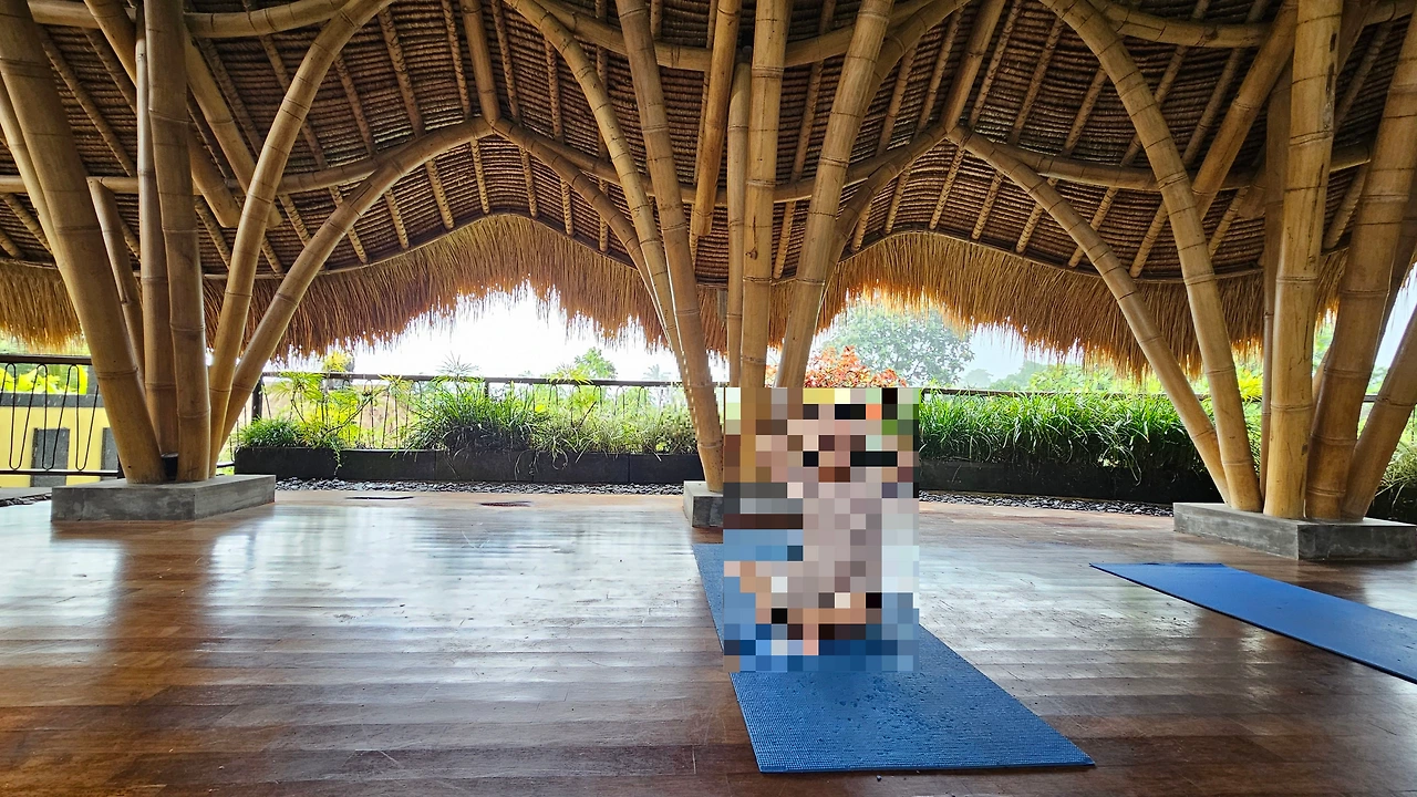 The Sankara Suites Villas 요가장. 07:00에 빌라 내 요가장에서 현지 여성 요가 선생님의 지도하에 한 시간 동안 꼬맹이 가족과 함께 요가 실습을 했다. 천천히 숨을 들이고 내쉬는 호흡법을 항상 기억하고 실천해야 하겠다는 결심을 했다. 풀을 건조해 만든 지붕을 알랑알랑(Alang-Alang)이라고 한다. 한국 시골 초가집의 지붕선을 아주 많이 닮았다. 내부는 대나무로 기둥과 천정을 절묘하게 조립하여 연결하였다. 대나무의 굵기와 길이 그리고 뚜께는 유연하지만 튼실하다. 아름다운 예술 작품이다.
