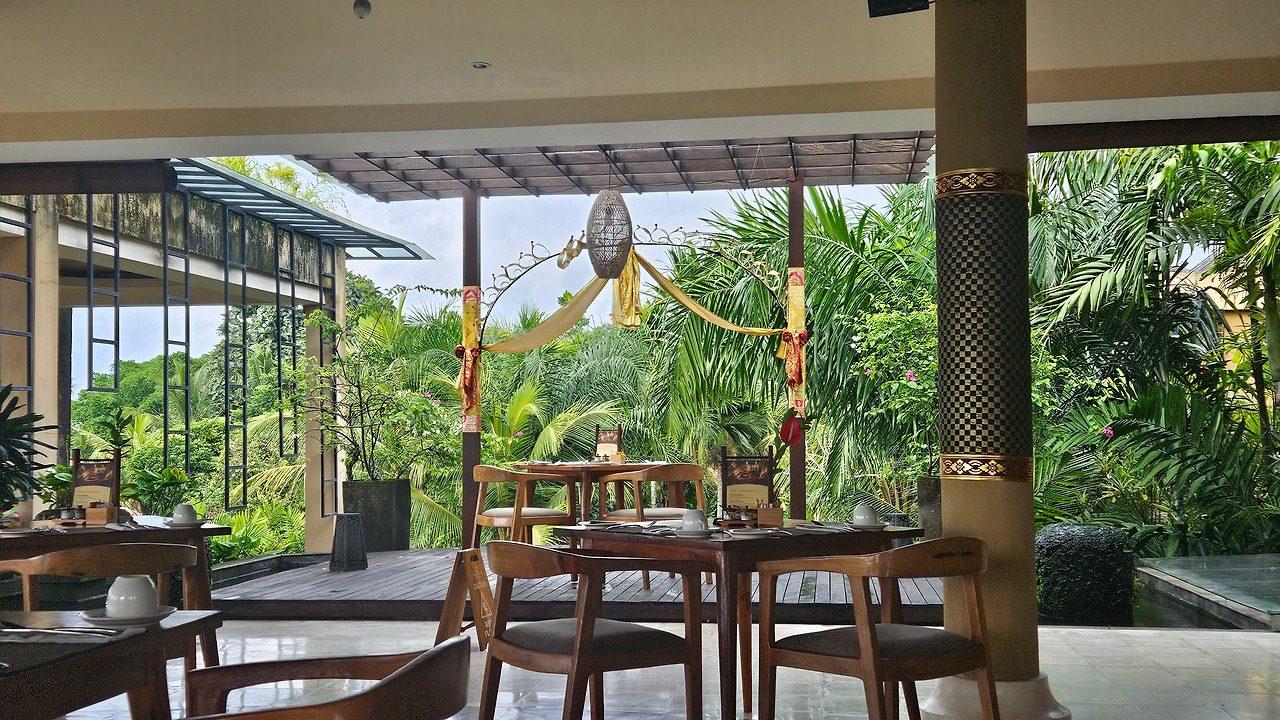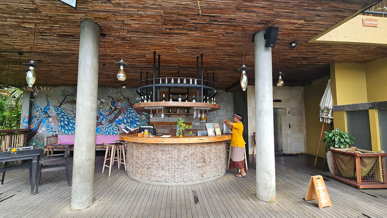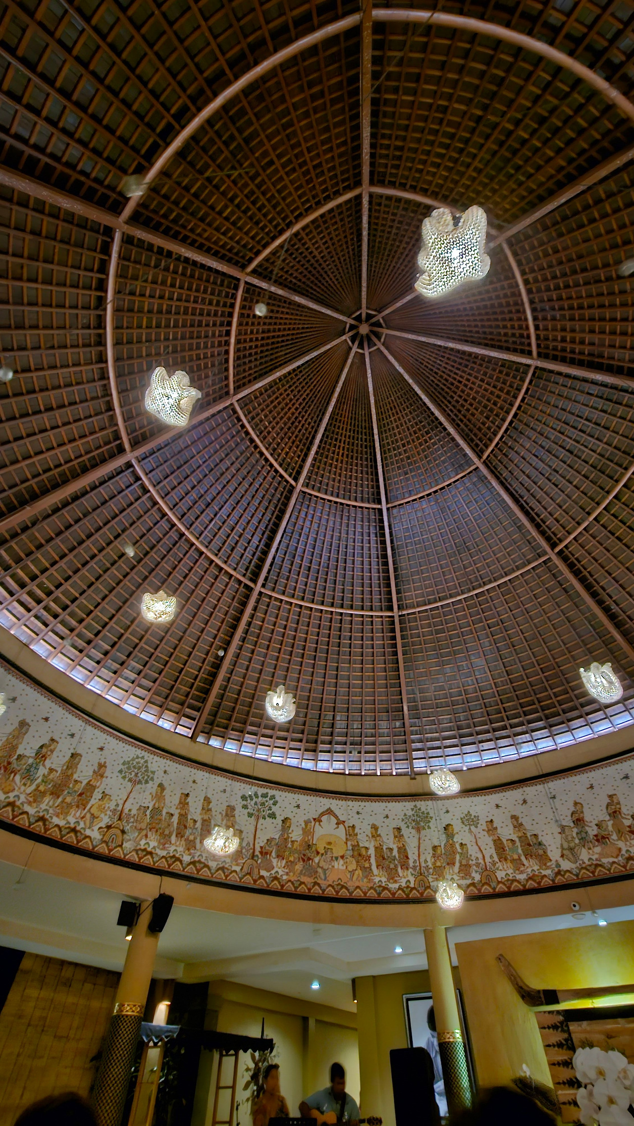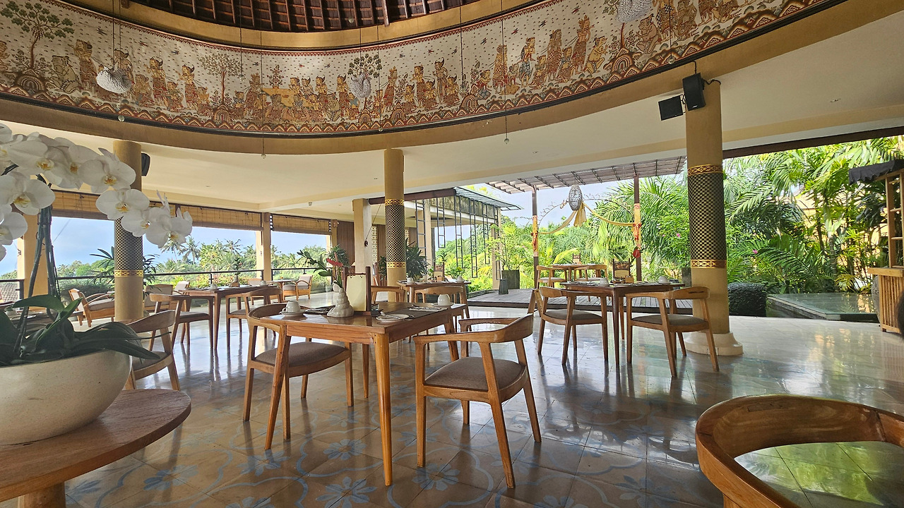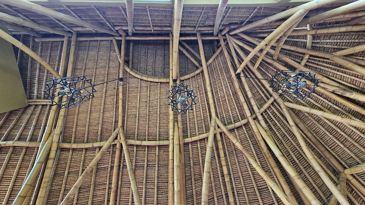The Sankara Suites Villas 요가장. 07:00에 빌라 내 요가장에서 현지 여성 요가 선생님의 지도하에 한 시간 동안 꼬맹이 가족과 함께 요가 실습을 했다. 천천히 숨을 들이고 내쉬는 호흡법을 항상 기억하고 실천해야 하겠다는 결심을 했다. 풀을 건조해 만든 지붕을 알랑알랑(Alang-Alang)이라고 한다. 한국 시골 초가집의 지붕선을 아주 많이 닮았다. 내부는 대나무로 기둥과 천정을 절묘하게 조립하여 연결하였다. 대나무의 굵기와 길이 그리고 뚜께는 유연하지만 튼실하다. 아름다운 예술 작품이다.