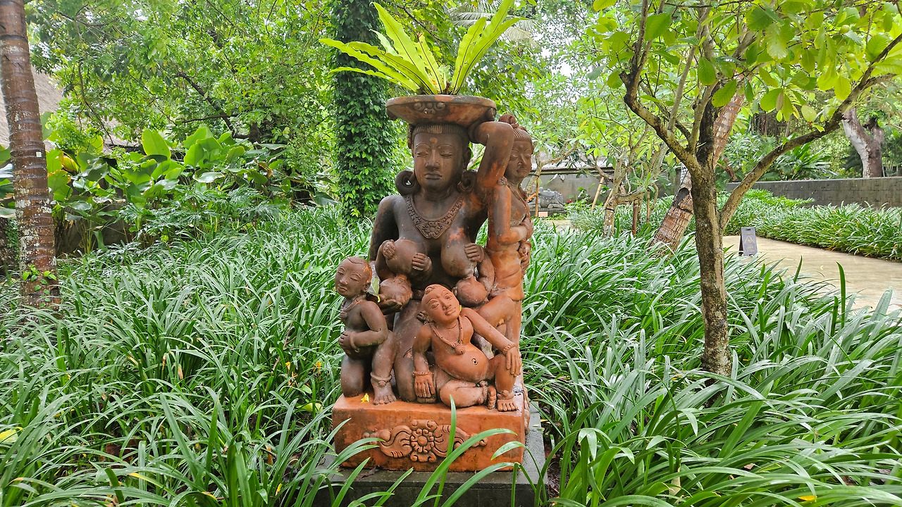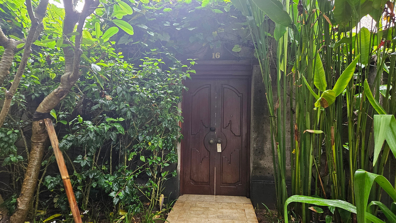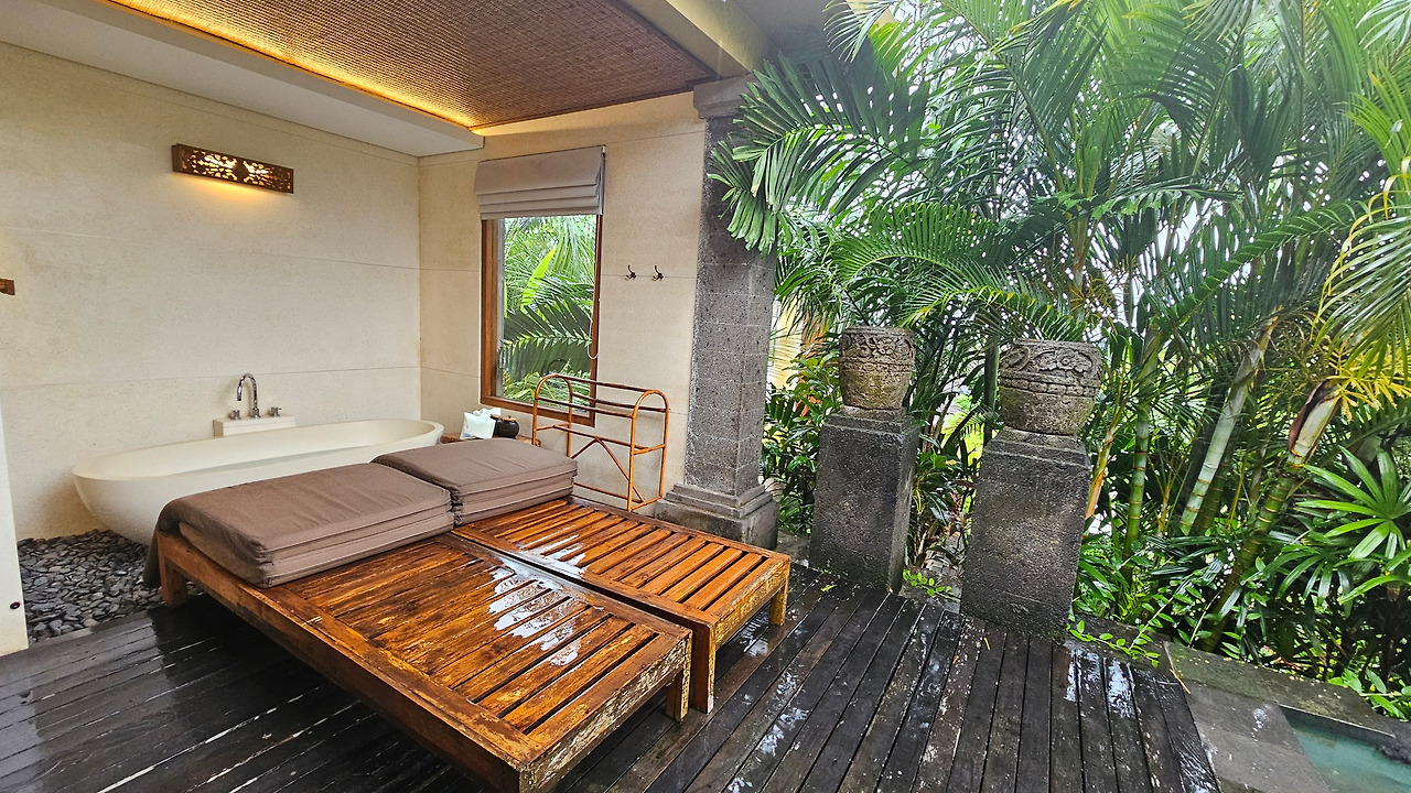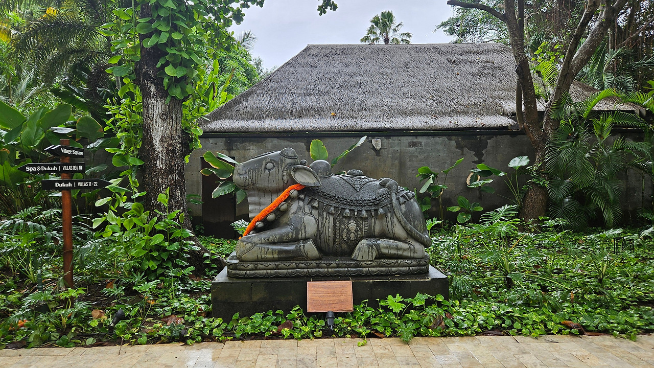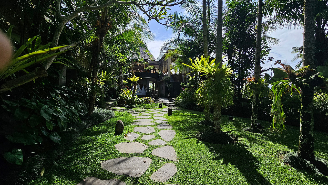 The Sankara Suites Villas 요가장. 07:00에 빌라 내 요가장에서 현지 여성 요가 선생님의 지도하에 한 시간 동안 꼬맹이 가족과 함께 요가 실습을 했다. 천천히 숨을 들이고 내쉬는 호흡법을 항상 기억하고 실천해야 하겠다는 결심을 했다. 풀을 건조해 만든 지붕을 알랑알랑(Alang-Alang)이라고 한다. 한국 시골 초가집의 지붕선을 아주 많이 닮았다. 내부는 대나무로 기둥과 천정을 절묘하게 조립하여 연결하였다. 대나무의 굵기와 길이 그리고 뚜께는 유연하지만 튼실하다. 아름다운 예술 작품이다.