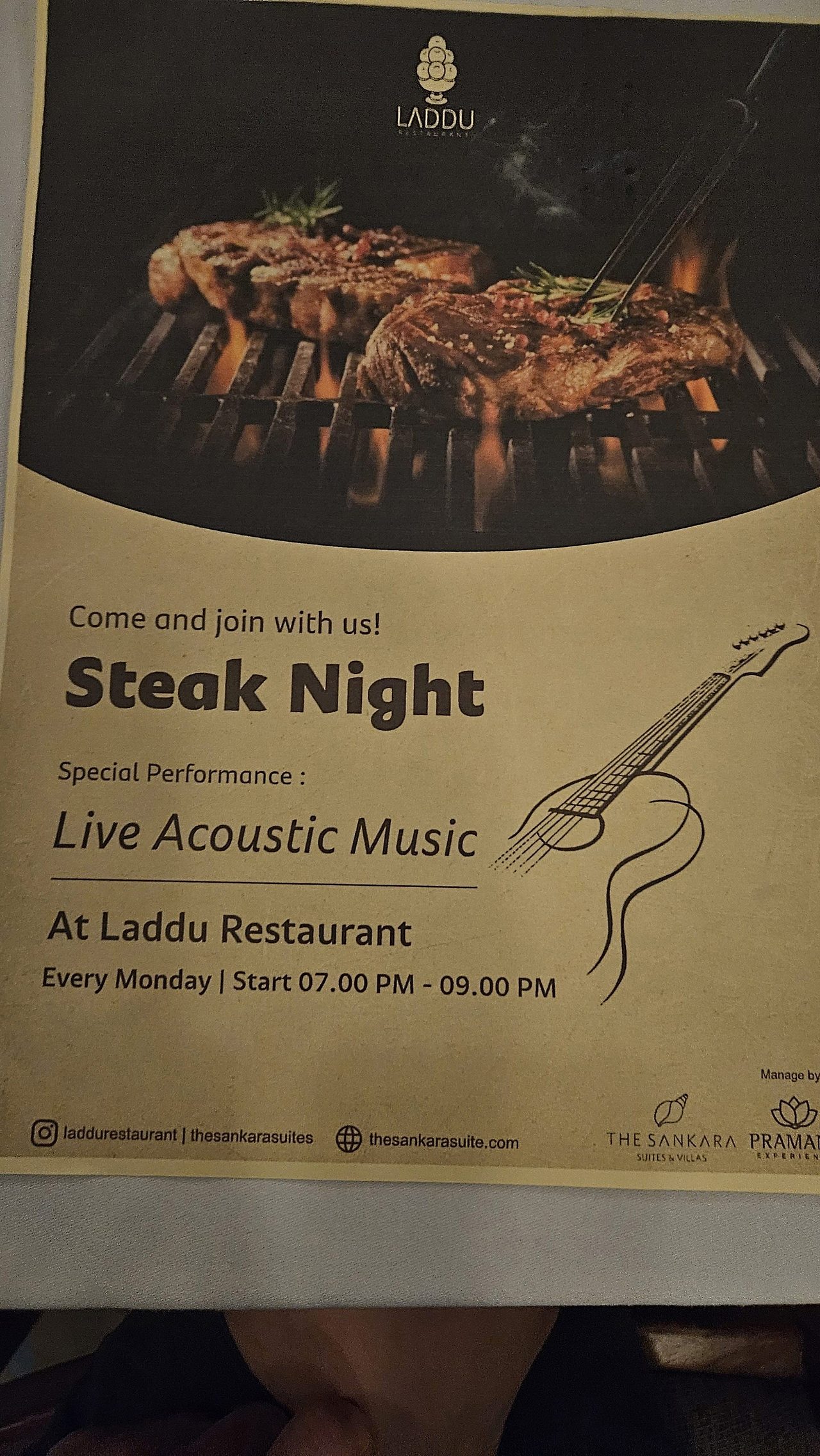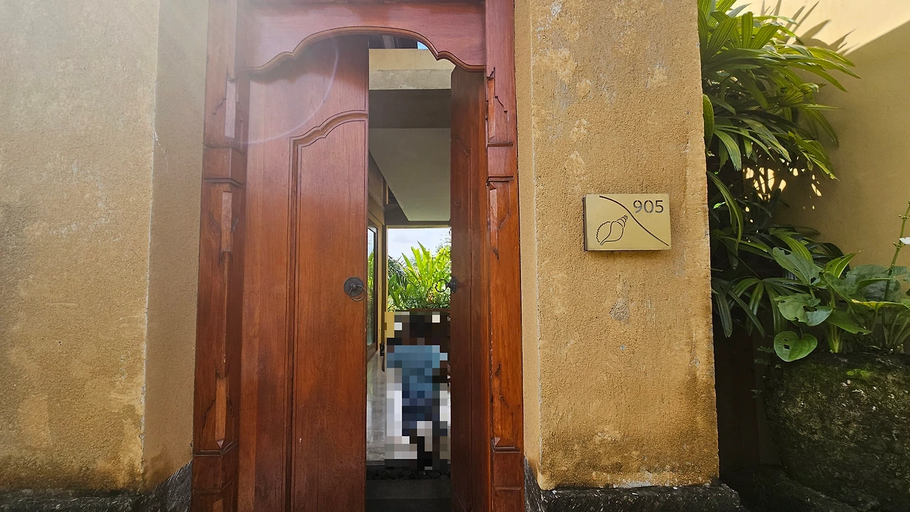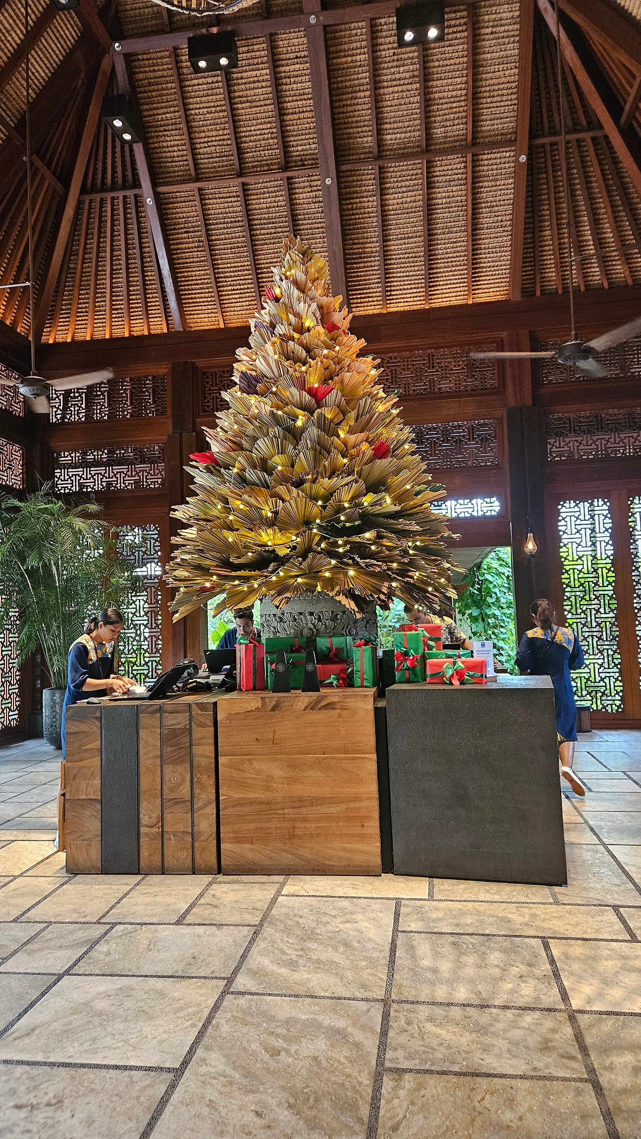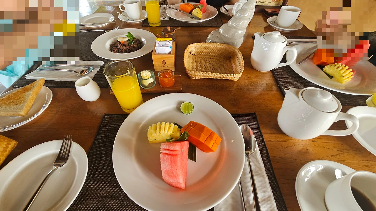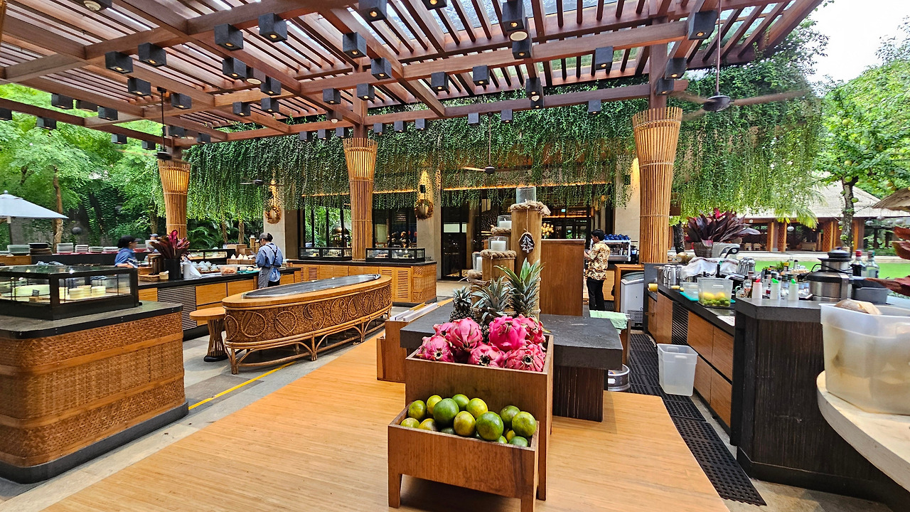 The Sankara Suites Villas 요가장. 07:00에 빌라 내 요가장에서 현지 여성 요가 선생님의 지도하에 한 시간 동안 꼬맹이 가족과 함께 요가 실습을 했다. 천천히 숨을 들이고 내쉬는 호흡법을 항상 기억하고 실천해야 하겠다는 결심을 했다. 풀을 건조해 만든 지붕을 알랑알랑(Alang-Alang)이라고 한다. 한국 시골 초가집의 지붕선을 아주 많이 닮았다. 내부는 대나무로 기둥과 천정을 절묘하게 조립하여 연결하였다. 대나무의 굵기와 길이 그리고 뚜께는 유연하지만 튼실하다. 아름다운 예술 작품이다.