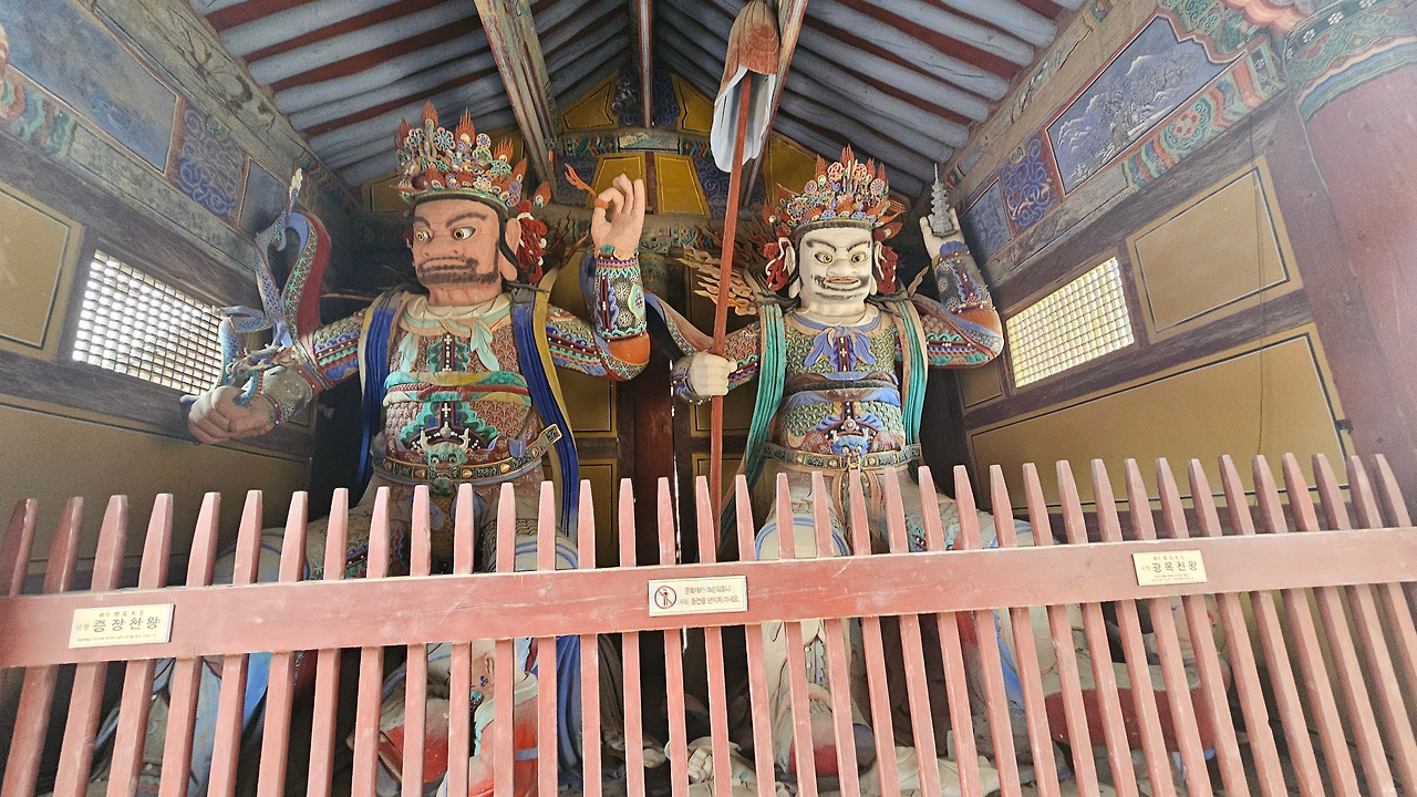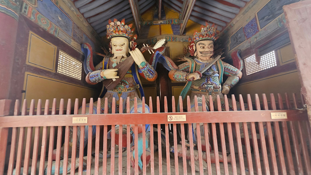 건물 내부는 중앙칸을 통로로 하고 좌우 측간에는 목조의 거대한 사천왕상(四天王像)을 배치하고 있다.