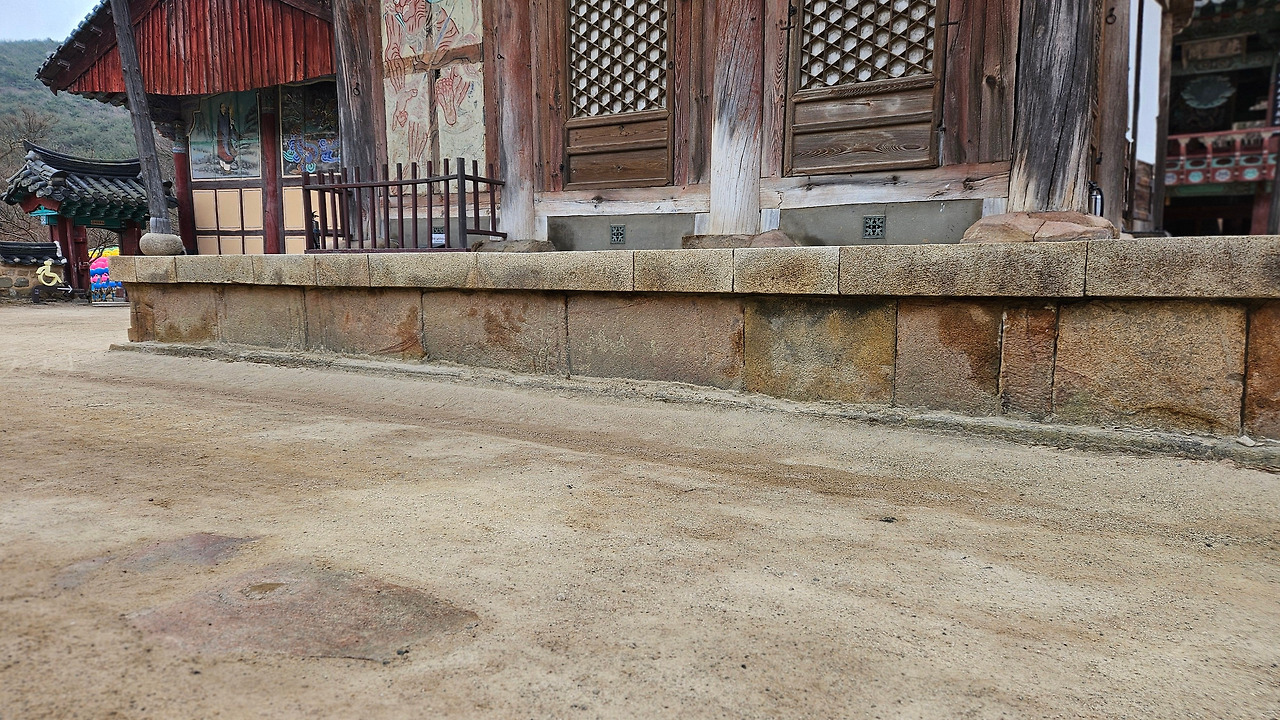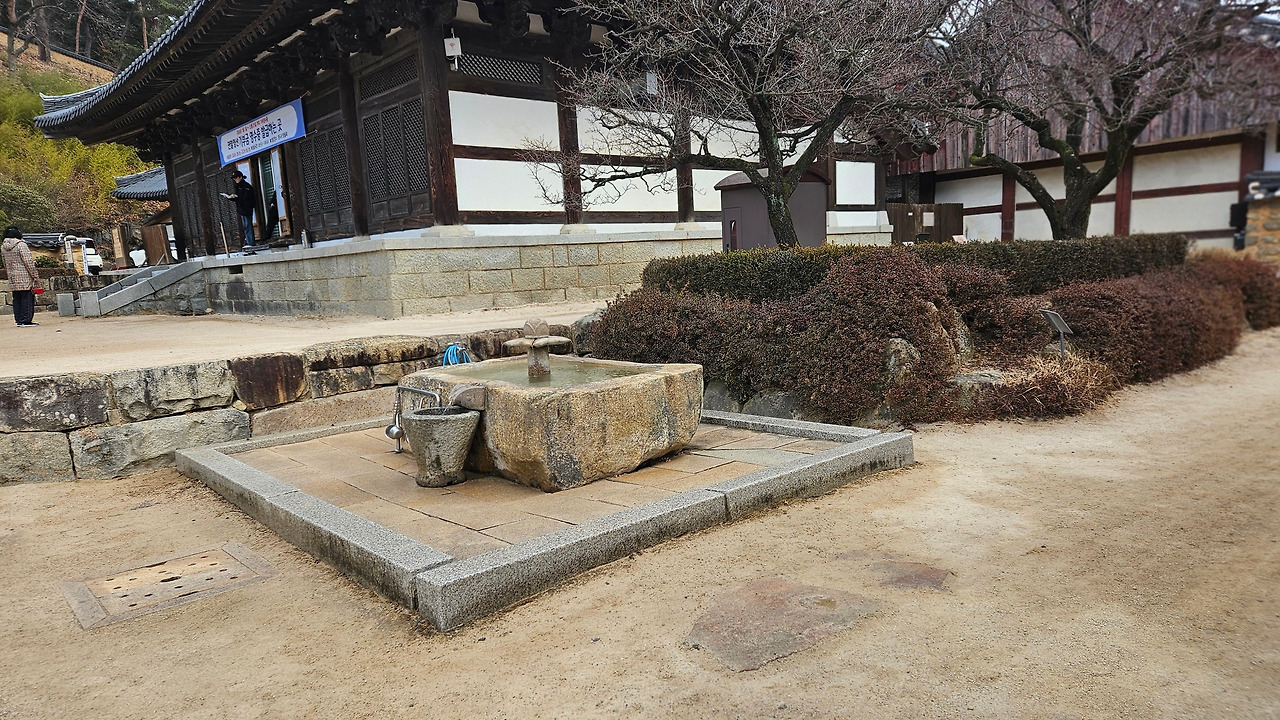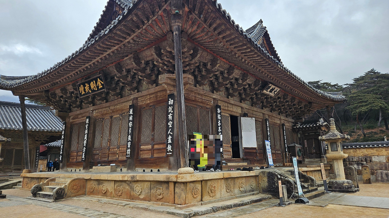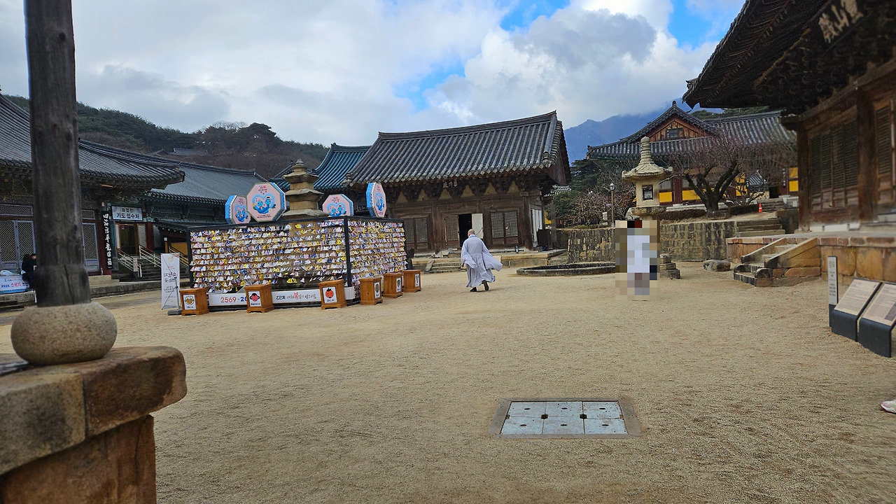 또 어떤 행사가 방금 끝났는지, 대웅전 금강계단 현판 앞마당에서 10여 명의 불자들과 스님들이 함께 불이문 방향으로 빠른 걸음으로 이동하고 있었다. 그 와중에 한 스님에게 팸플릿에 나와 있는 호혈석의 위치를 여쭈어 보았다. 손수 극락보전 측면에 있는 호혈석까지 직접 안내해 주셨다.