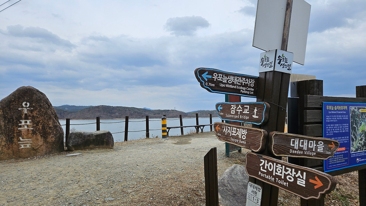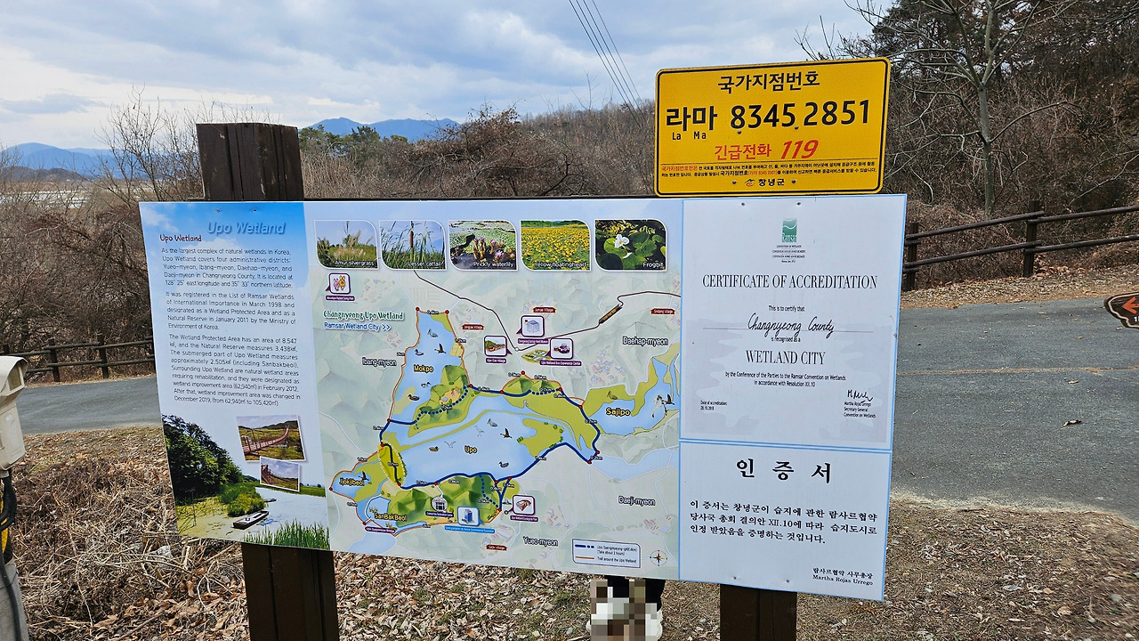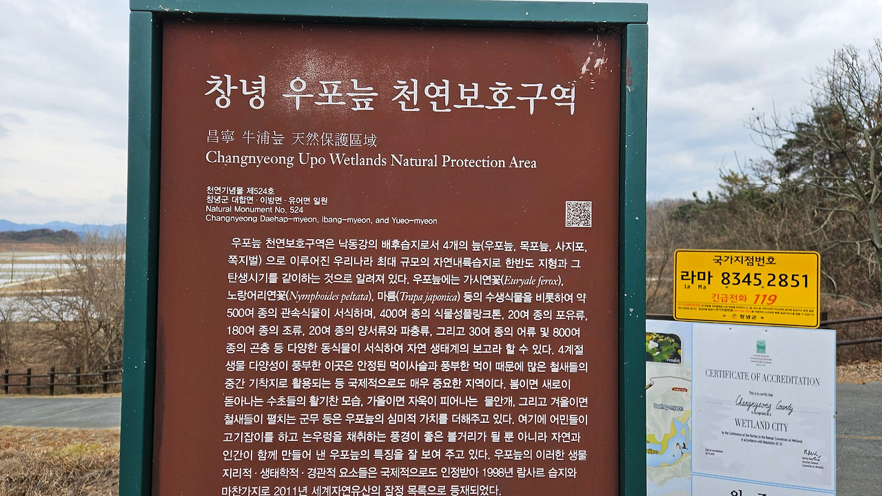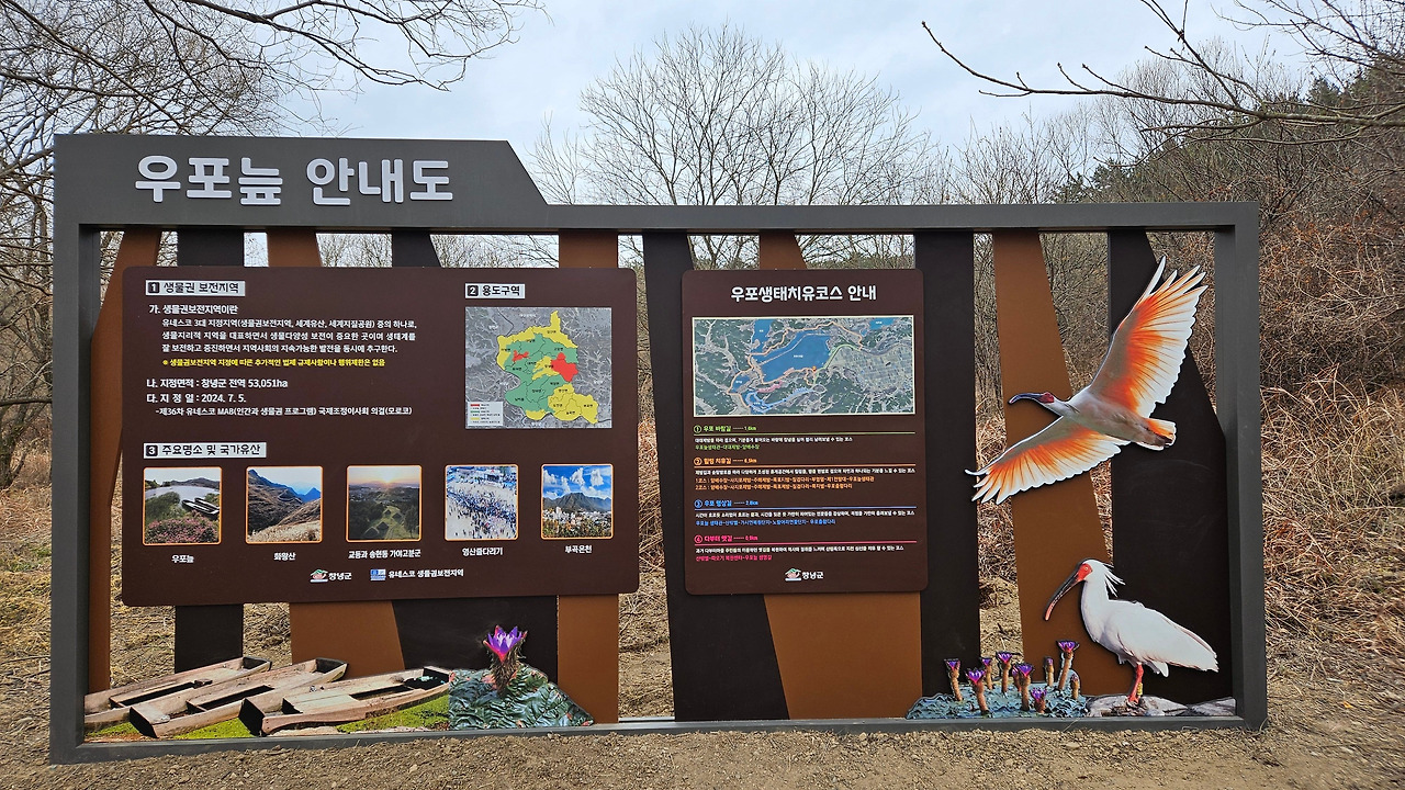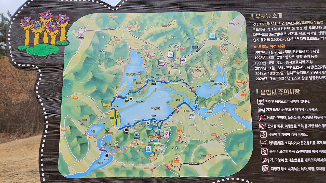 당초 자전거를 타고 우포늪 일주하는 계획을 가지고 있었다. 그런데, 우포늪 관광 안내소에 들러 여러 종류의 팸플릿을 받고, 안내하시는 분에게 자전거 대여소 위치를 물어보니, 굳이 자전거를 탈 필요가 없다며, 약 10일 전에 조류 독감으로 우포늪 탐방로 출입을 제한한다는 공고가 났다고 했다. 다행히 우포늪 입구 안내소에서 대대제방 종료지점까지(약 2km)는 탐방로 출입이 가능하다고 했다. (2025.01.15일부~ 상황 종료 시까지) 전 구간 탐방을 위하여, 하루빨리 조류 독감이 물러 났으면 좋겠다. 탐방 못한 나머지 구간의 정보를 팸플릿과 안내 표지판 등을 통하여 최대한 긁어 왔다.