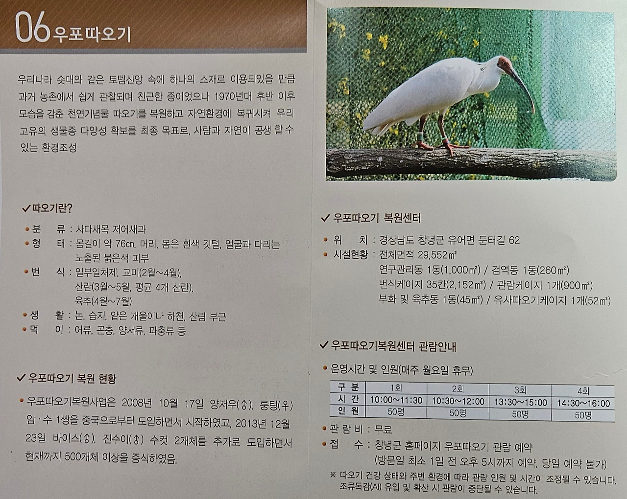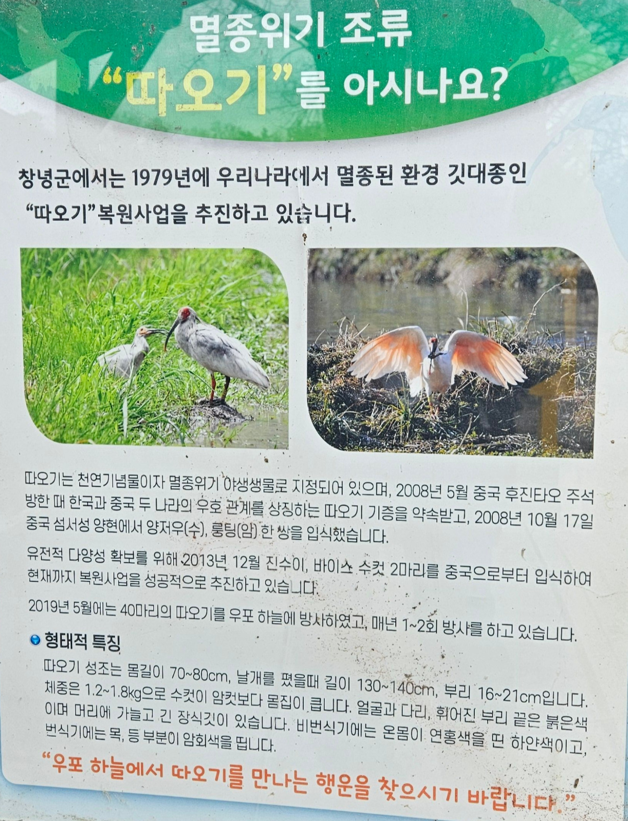 특히 한반도에서 멸종된 따오기(천연기념물 제198호, 멸종위기 야생생물 2급)를 중국에서 1 쌍을 초빙하여 복원에 성공하였다. 현재 500마리 이상 살고 있다고 한다. 2019년 5월 우포늪으로 야생 방사하여 친환경 브랜드 가치를 높이고 있다.