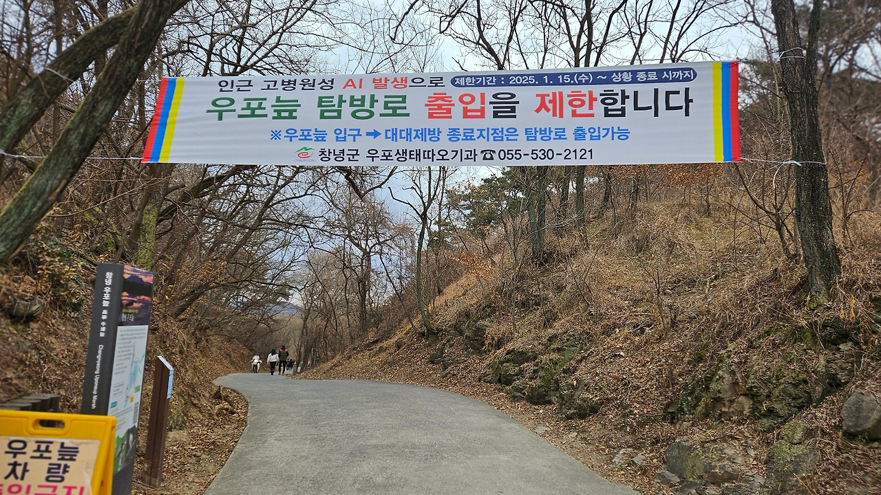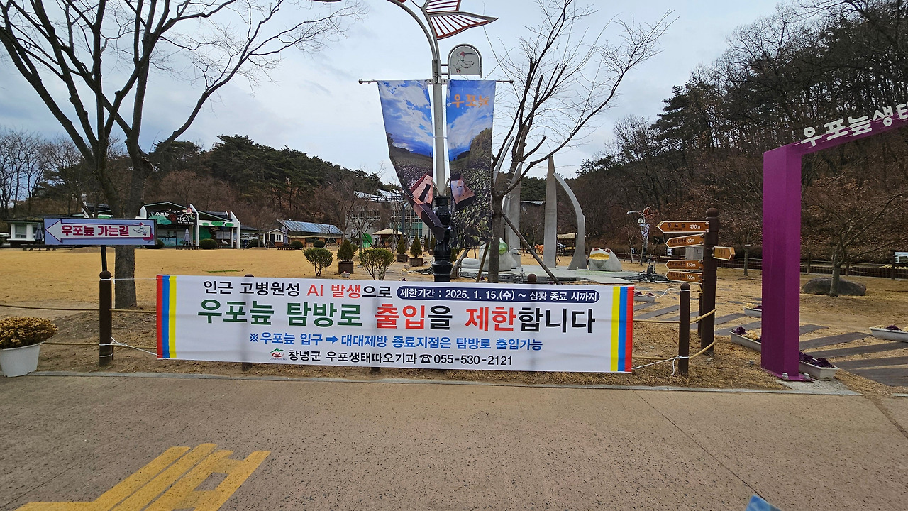 우포늪 인근 고병원성 AI 발생으로 인해 지난 2025. 1. 15.(수)부터 시행한 우포늪 탐방로 출입제한을, 다음과 같이 2025.03.01부로 해제하였습니다. 혹시, 우포늪 탐방 계획이 있으시다면, AI발생등 탐방시의 환경 변화를 사전에 체크하세요. 우포늪 홈페이지는 다음 (www.cng.go.kr/tour/upo.web)과 같습니다.