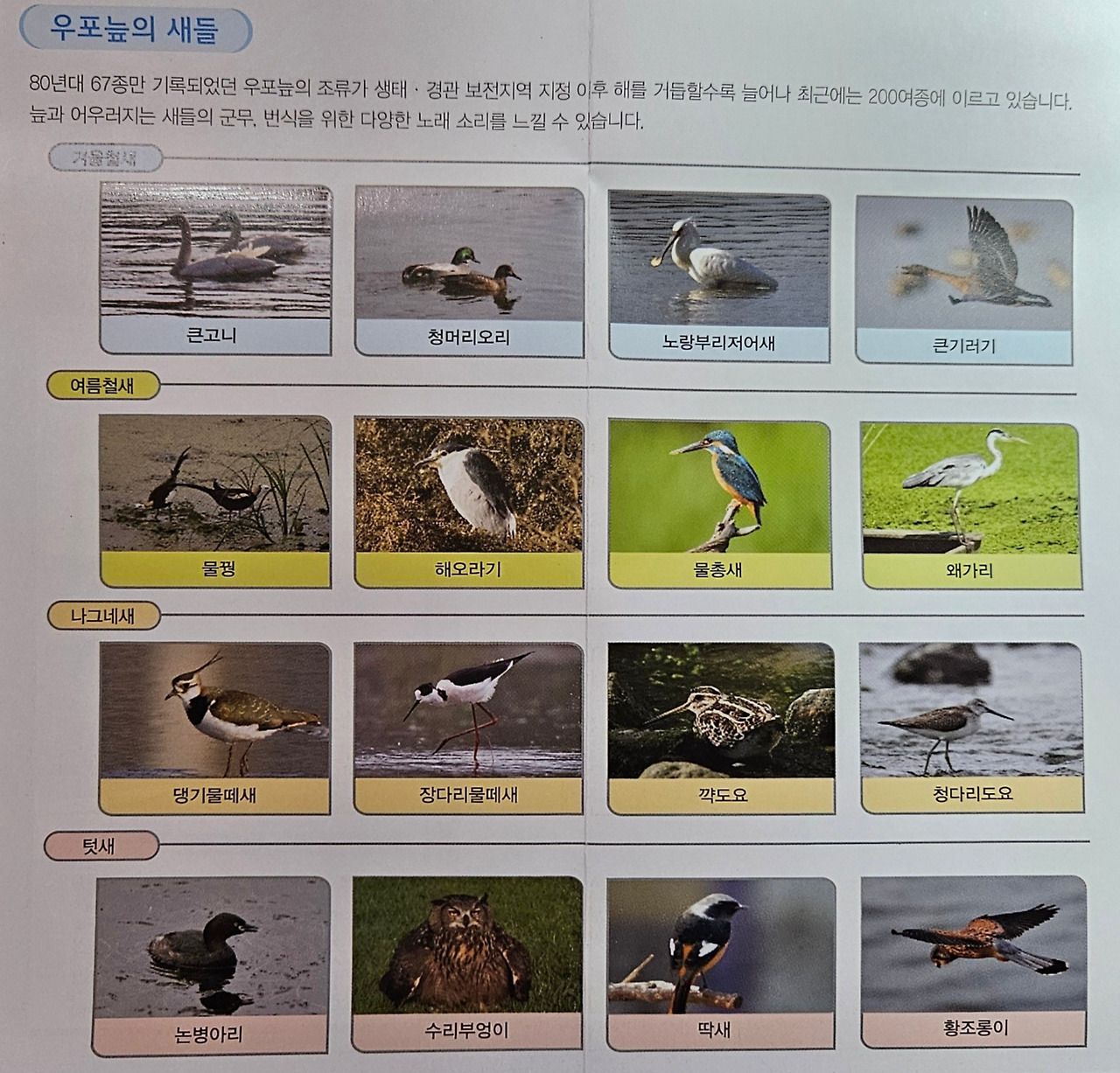 철새도래지로서 천연기념물인 큰고니, 노랑부리저어새 등 200여 종의 조류와 멸종위기종 수달, 담비, 삵등 200여 종의 동물들이 서식하고 있다.