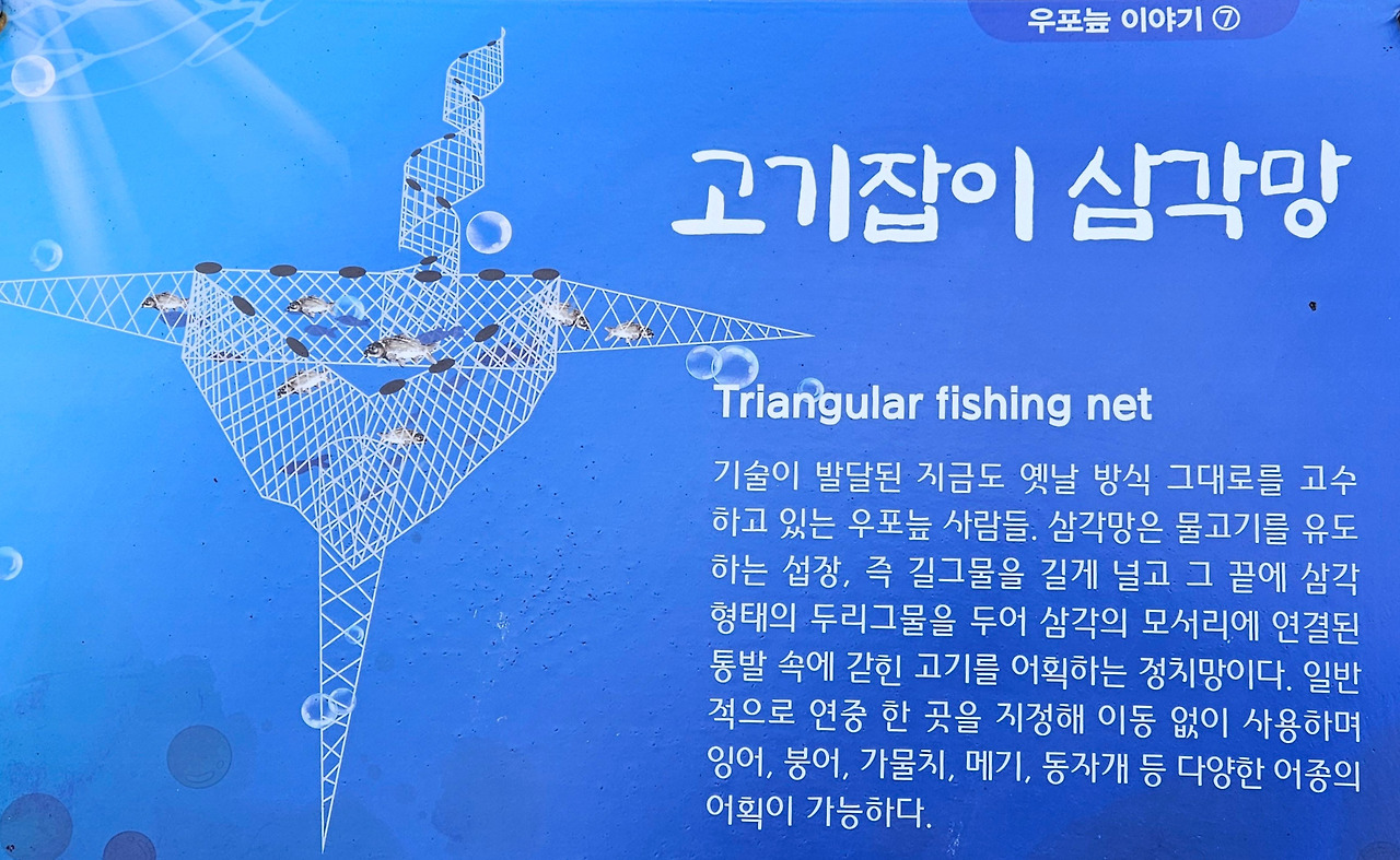 옛날 전통 방식의 삼각형 어망으로 고기를 어획하는 정치망이다. 한 곳에 이동 없이 펼쳐 둔다.