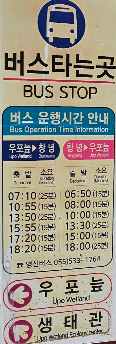 -. 버스 : 창녕 시외버스터미널에서 도보 3분 이동---> 영신버스터미널~우포늪 세진주차장 25분 또는 15분 소요-직행, 일 6회 운영