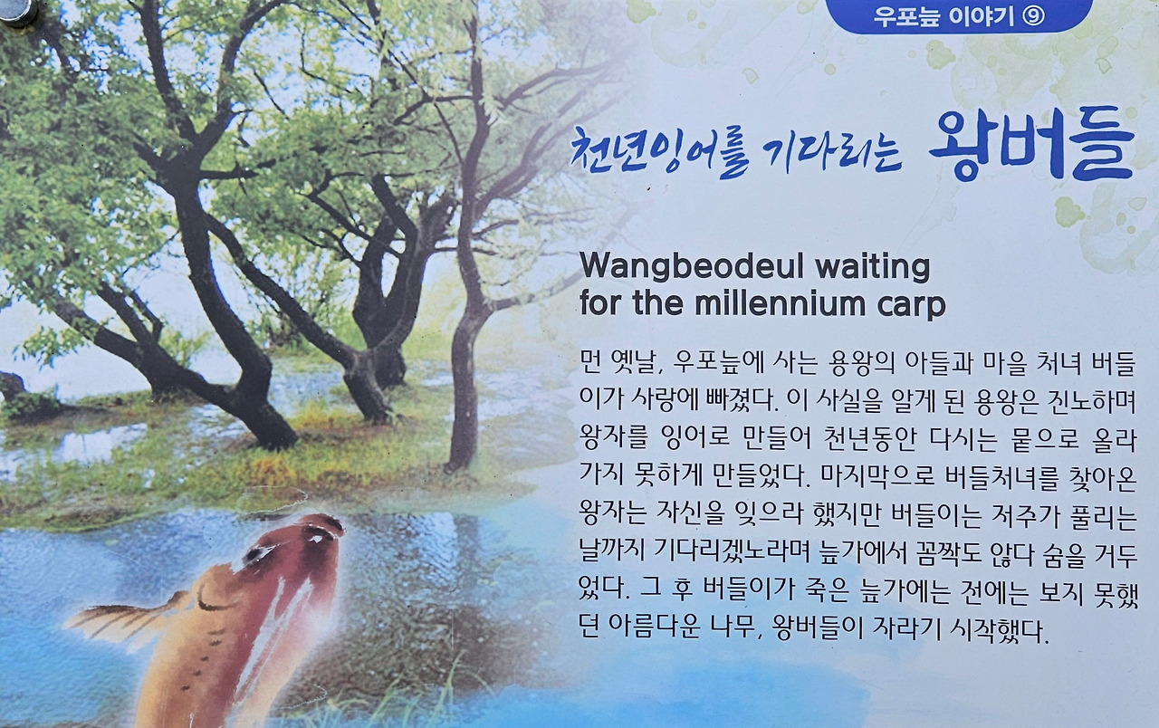 우포늪 용왕의 아들과 마을 처녀 버들이 사랑에 빠졌다. 용왕이 진노하여 아들을 잉어로 만들어 뭍으로 올라가지 못하게 만들어 버렸다. 버들이는 늪가에서 용왕의 저주가 풀리기를 기다렸으나, 끝내 소원을 이루지 못하고 죽었다. 그 후 늪가에는 버들이의 혼인 아름다운 왕버들이 자라기 시작했다.