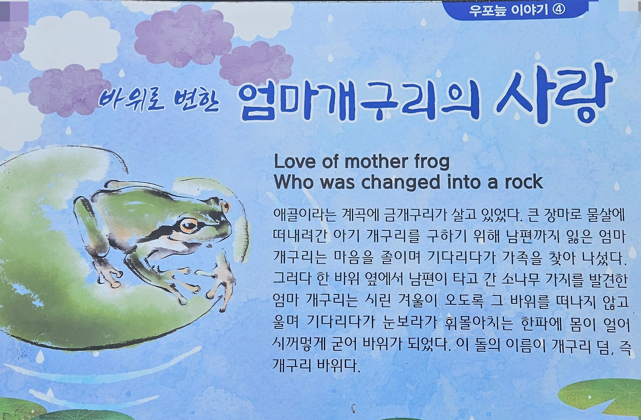 큰 장마에 떠내려간 아기 개구리를 바위에 앉아 기다리다가, 한 겨울 한파에 몸이 얼어 시커먼 바위가 되었다는 슬픈 전설의 엄마 금개구리 이야기다.