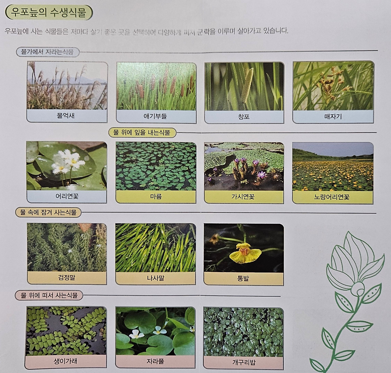 우포늪에는 1,200여 종의 생물들이 살고 있다. 가시연꽃, 자라풀, 수염마름, 창포 등 800여 종의 식물들이 있다.