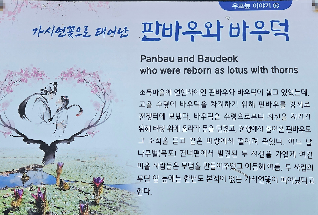 소목마을의 비극적인 사랑이야기다. 고을 수령이 아름다운 소녀 바우덕을 차지하기 위해 그녀의 연인인 판바우를 전쟁터로 보냈다. 바우덕은 수령으로부터 자신을 지키기 위해 벼랑 위에서 몸을 던졌다. 전쟁터에서 살아 돌아온 판바우가 그 사실을 알고 같은 바위에서 떨어져 죽었다. 목포벌(나무벌) 건너편에서 발견된 두 시신의 무덤을 만들었다. 얼마 후 무덤 앞에 가시연꽃이 피어났다는 애달픈 전설이다.