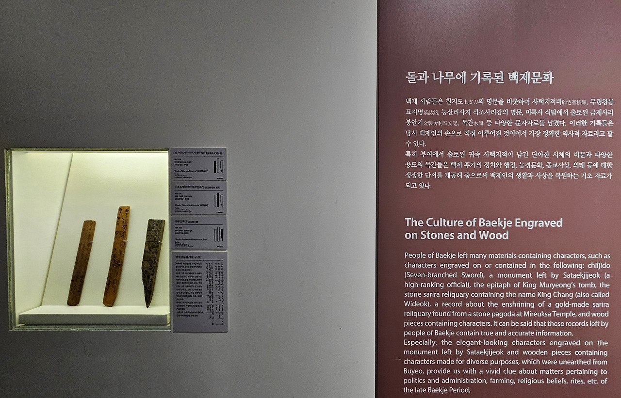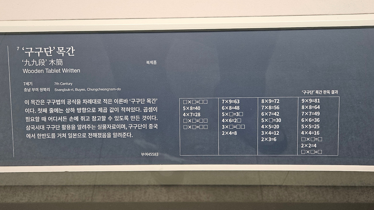 나무에 기록된 백제문화를 볼 수 있다. 구구단 남근형 신세한탄 망부가등 다양한 내용이다. 그 가운데 특이한 것은 구구단 목간이다. 예를 들면, 7*9= 63, 6*8=48등이다.