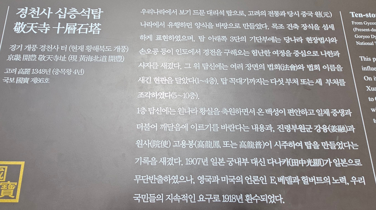 현재 국립중앙박물관 1층에 고려의 불굴의 기상처럼 우뚝 솟아 있다. 원래는 경기도 개풍군에 있던 대리석 탑이다. 1907년 일본 궁내부 대신 다나카가 일본으로 무단 반출하였으나, 영국과 미국의 언론인 베델과 헐버트의 노력, 우리 국민들의 지속적인 요구로 1918년 환수되었다.