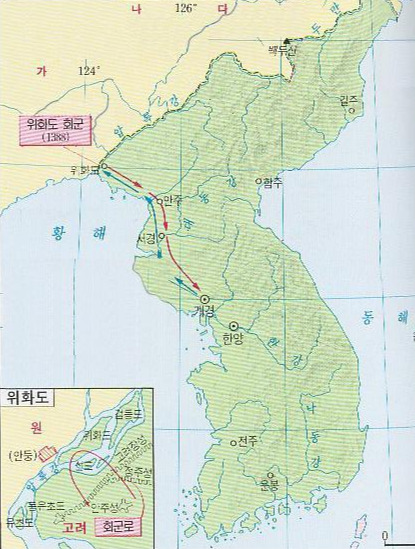 압록강을 건너 요동으로 가는 중간 기착지 위화도에서, 1388년 이성계는 군대를 돌렸다.
