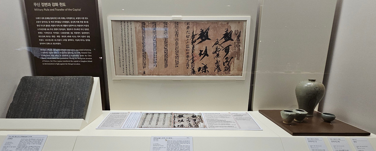 12세기 귀족문화를 꽃피우던 시기에 이자겸의 난, 묘청의 서경 천도운동이 일어났다. 문신의 차별대우와 의종의 사치 생활과 실정으로 1170년(의종 24) 무신정변이 일어났다. 정중부 경대승 이의민으로 이어졌고 1196년(명종 26) 최충헌이 집권하면서 최우 최항 최의의 4대 최 씨 정권이 성립되었다. 1231년(고종 18) 몽골이 침입하자, 1232년 최이는 항쟁을 결의하며 강화도로 천도하였다. 강화 산성과 강화역사박물관 탐방에 대하여 이미 보고를 드렸다. (https://brunch.co.kr/@jylee2020/161 및 https://brunch.co.kr/@jylee2020/162, 2024.04.06 탐방)