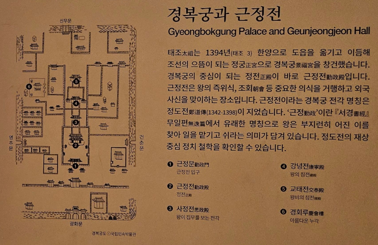경복궁의 중심인 정전이다. 왕 즉위식, 조회, 외국 사신을 맞이하던 장소다. 좌우측에 품계석이 있어 직위에 따라 도열한다.