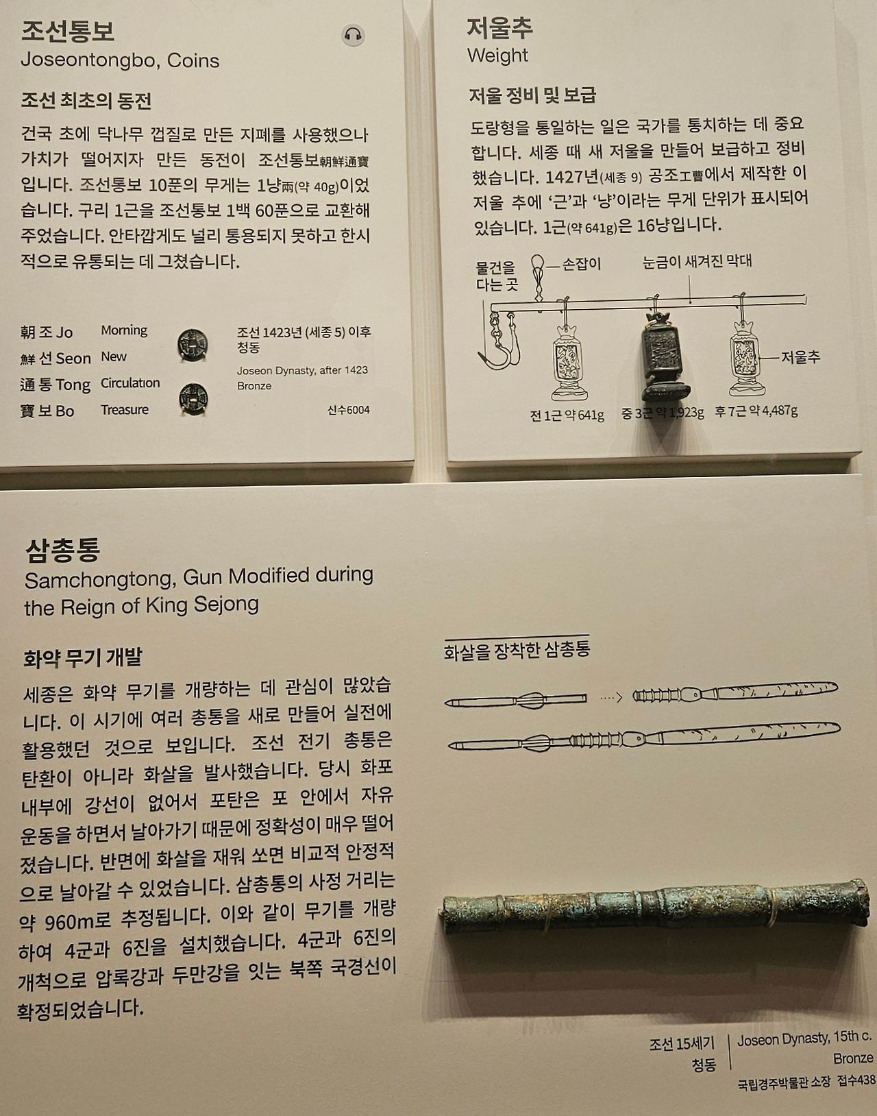 1427년(세종 9) 공조에서 제작, 저울추에 근과 냥이라는 무게 단위가 표시되어 있다. 1근(약 641g)은 16냥이다.