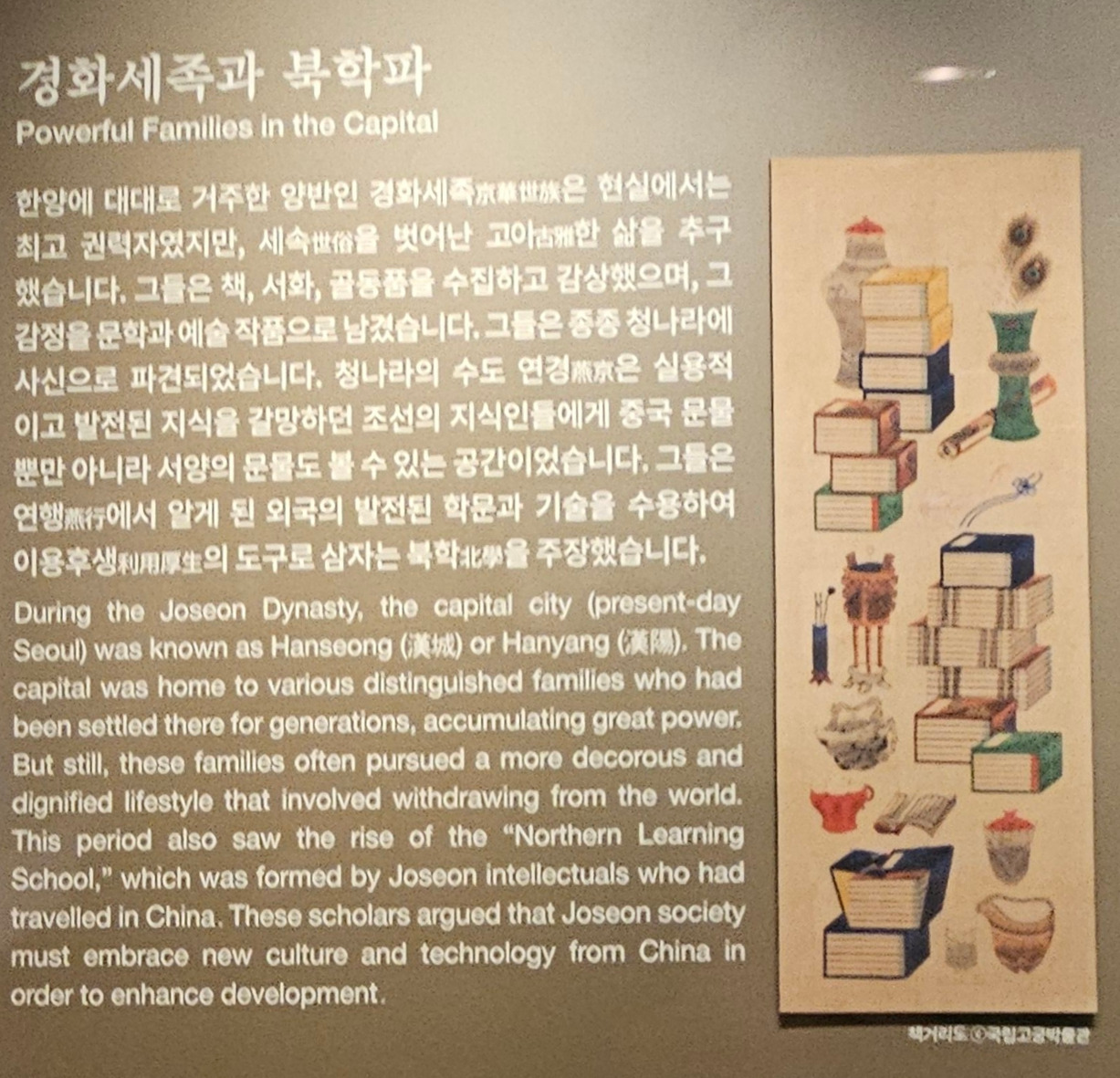 한양에 대대로 거주한 양반인 경화세족은 최고권력자였지만, 세속을 벗어난 고아한 삶을 추구하였다. 책, 서화, 골동품을 수집 감상하고 그 감정을 문학과 예술 작품에 남겼다. 종종 청나라에 사신으로 파견되어, 중국과 서양 문물을 접할 수 있었다. 외국의 발전된 학문과 기술을 수용하여 이용후생의 도구로 삼자는 북학을 주장했다.