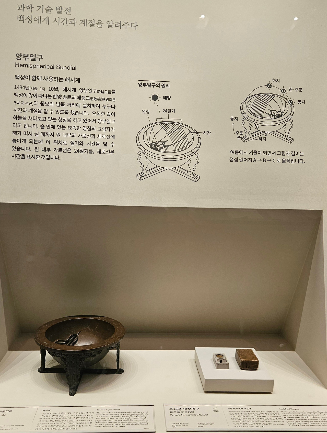1434년(세종 16) 10월 해시계인 앙부일구를 한양 종로의 혜정교(현 광화문 우체국 부근)와 종묘의 남쪽 거리에 설치하였다. 솥이 하늘을 바라보고 있는 형상이라 하여 앙부일구라 했다. 원내부 가로선은 24 절기를, 세로선은 시간을 표시한 것이다. 휴대용 앙부일구도 있다.