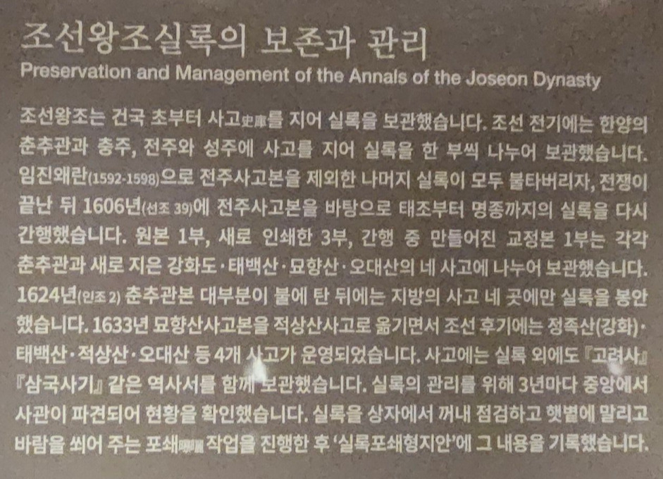건국 초부터 사고를 지어 실록을 보관했다. 한양의 춘추관, 충주, 전주와 성주에 사고를 지어 한 부 씩 보관했다. 전후에는 강화도, 태백산, 묘향산, 오대산 등 4개 사고가 운영되었다.