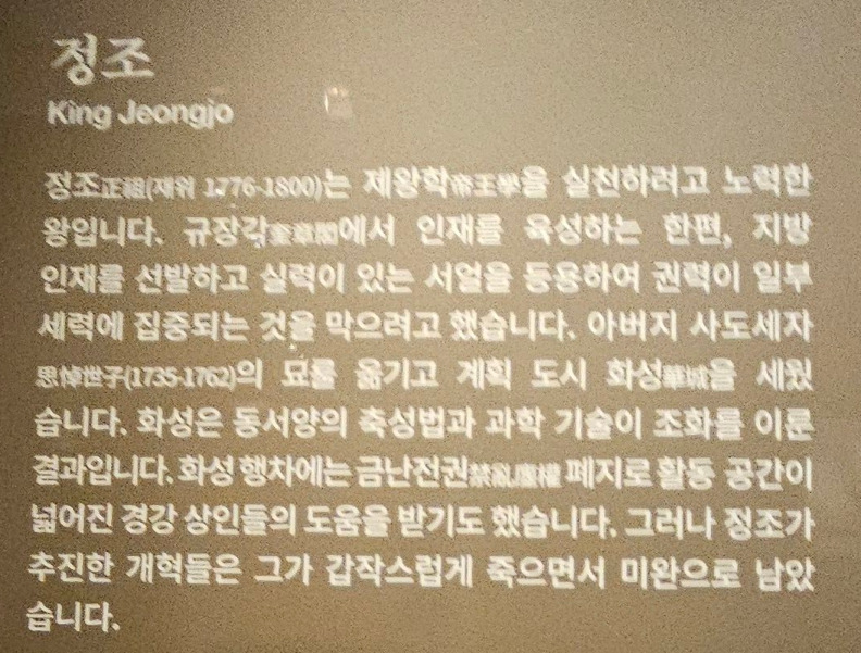 제왕학을 실천하려고 노력한 왕이다. 규장각에서 인재를 육성하고 지방인재를 선발하고 실력 있는 서얼을 등용하여 권력이 일부 세력에 집중되는 것을 막으려고 했다. 아버지 사도세자(1735~1762)의 묘를 이장하고 계획도시 화성을 세웠다. 동서양의 축성법과 과학기술을 응용했다. 화성행차에는 금난전권 폐지로 활동공간이 넓어진 경강상인들의 도움을 받았다. 아쉽게도 그의 개혁은 갑작스럽게 죽으면서 미완으로 남았다.