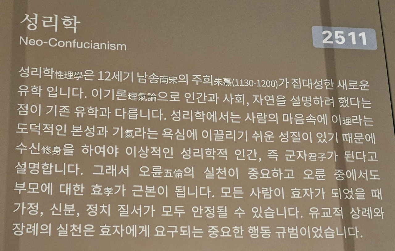 12세기 남송의 주희(1130~1200)가 집대성한 유학이다. 사람의 마음속에는 도덕적 본성과, 기라는 욕심에 이끌리는 마음이 있다. 수신을 하여 이상적인 성리학적 인간이 되는 것이 중요하다. 오륜중에서 부모에 대한 효가 근본이다.