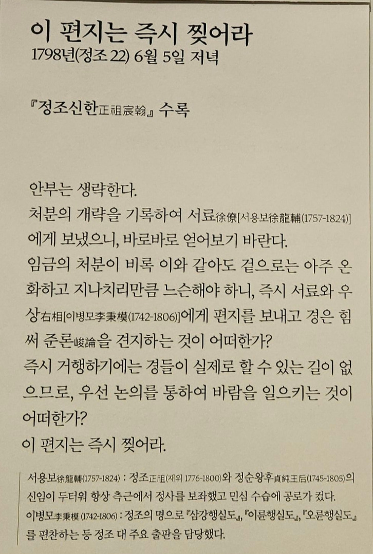 ~안부는 생략한다. ~ 즉시 거행하기에는 경들이 실제로 할 수 있는 길이 없으므로, 우선 논의를 통하여 바람을 일으키는 것이 어떠한가? 이 편지는 즉시 찢어라. (그러나 노론 벽파 영수이며 좌의정이었던 심환지는 찢어 없애지 않았다. 이 300여통의 편지들을 후손들에게 남겨서 물려 주었다. )