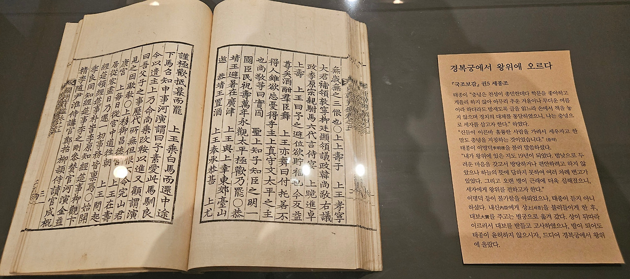 경복궁에서 왕위에 오르다. (국조보감 권 5, 세종조) 태종이 "충녕은 천성이 총민하고 학문을 좋아하고 책을 손에서 놓지 않고, 정치의 대체를 통달하였으니, 세자로 삼고자 한다"