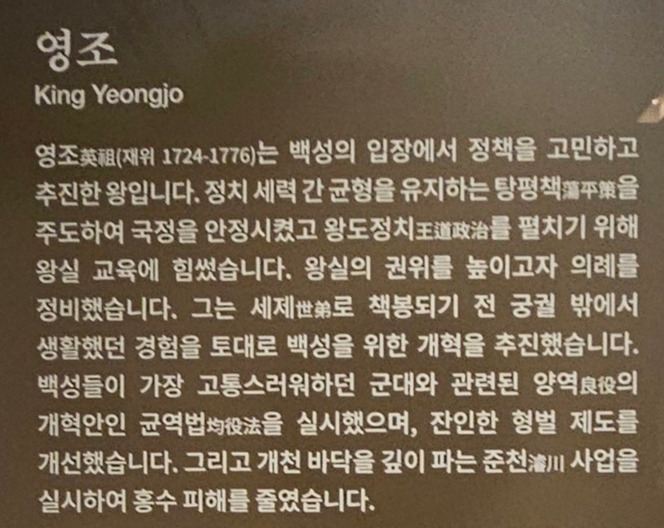 정치 세력 간 균형을 유지하는 탕평책을 실시하여 국정을 안정시켰고, 왕도정치를 펼치기 위해 왕실 교육에 썼다. 군대와 관련된 양역의 개혁안인 균역법을 실시했다. 잔인한 형벌 제도를 개선했다. 하천 바닥을 깊이 파는 준천사업을 실시하여 홍수피해를 줄였다. 역대 왕들의 선정을 기록한 국조보감에 영조의 치적이 기록되어 있다.